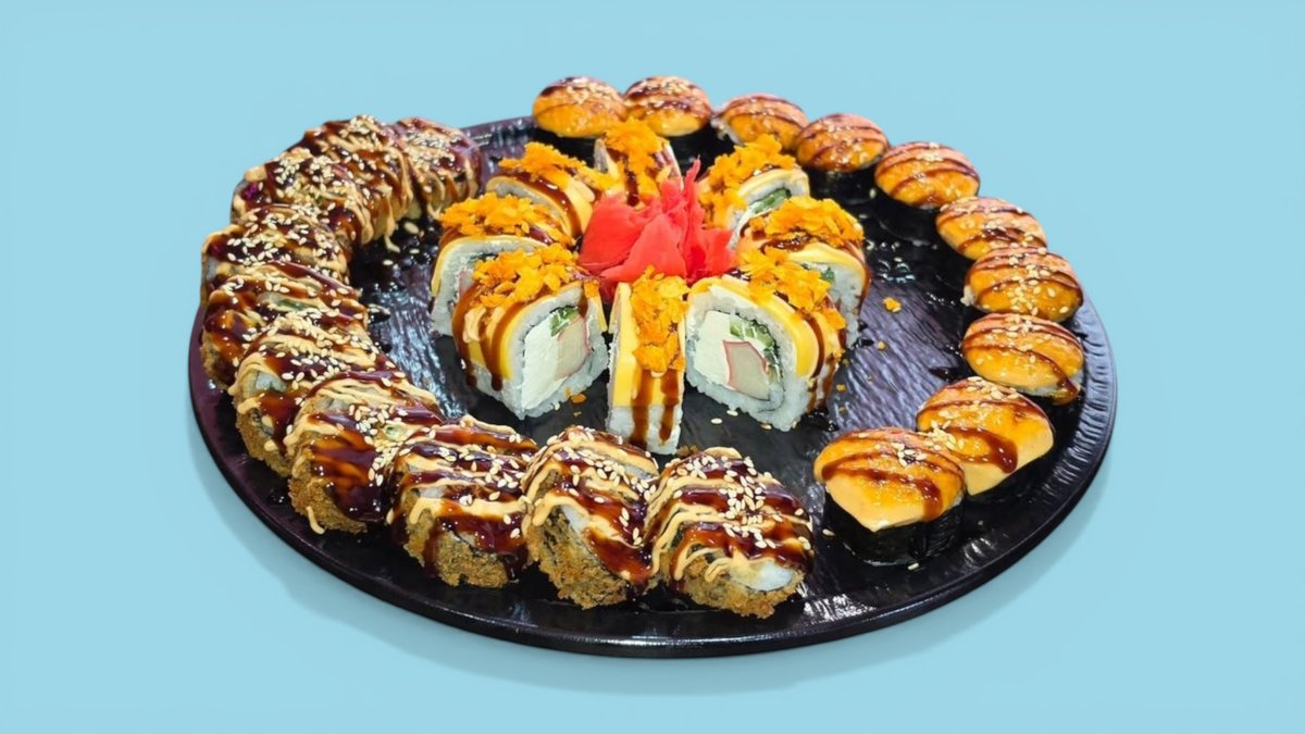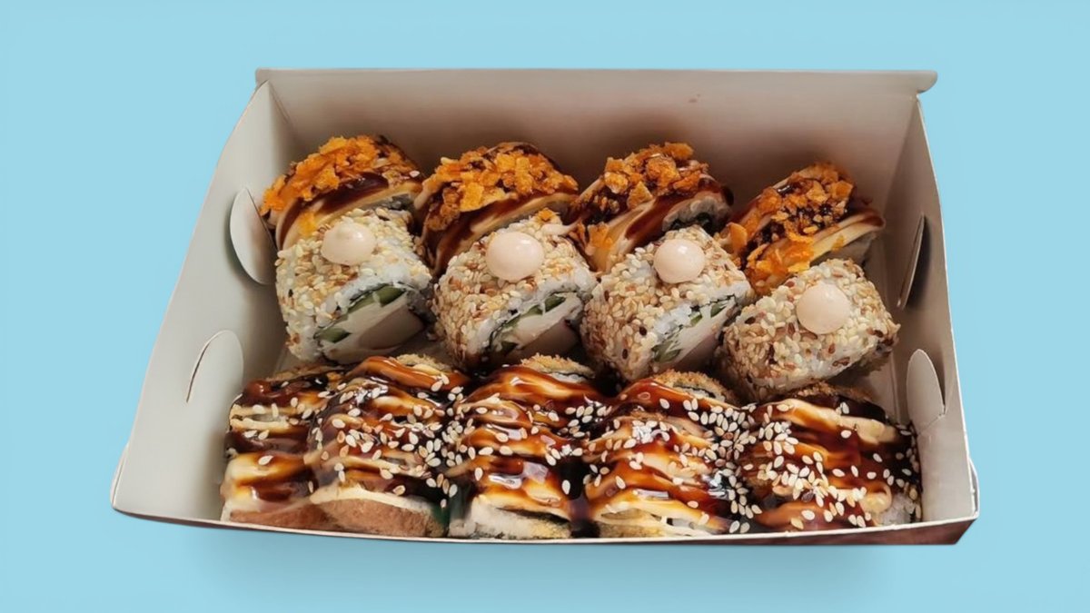 Tempura hot (10 eded) , Salmon hot (10 eded) ,Krab hot (10 eded) , Fladelfiya (8 eded) , California (8 eded) , Alyaska (8 eded) , Bonito (8 eded) , Cheese (8 eded)