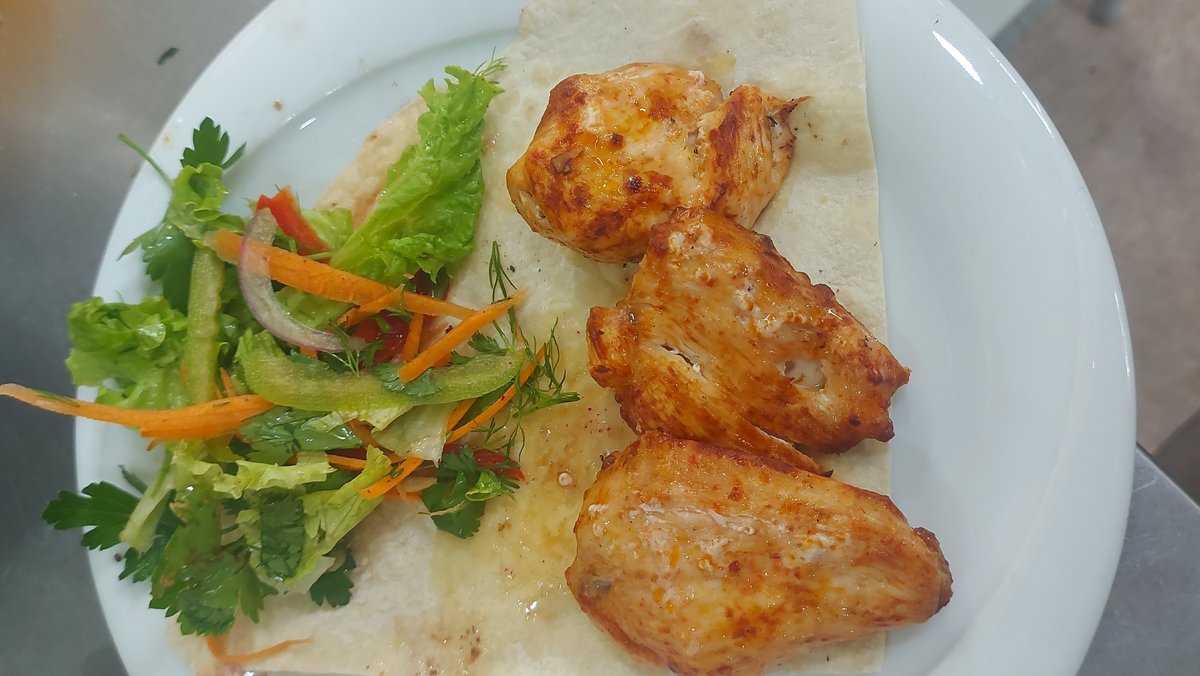 Toyuq filesi, quyruq, kök, kələm, soğan, pomidor, bibər, kartof fri, lavaş, istiot, duz, qaymaq