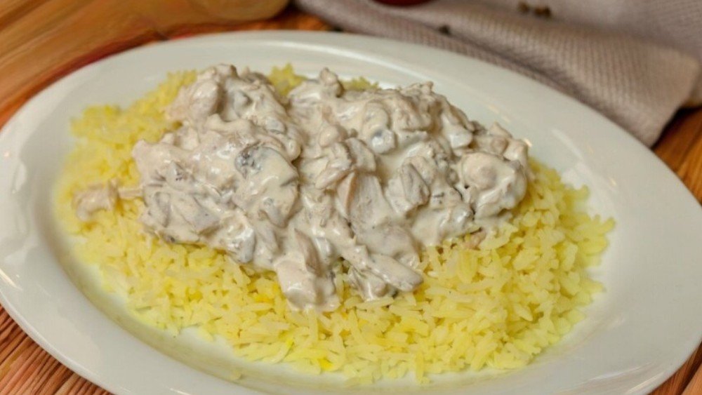 Toyuq, göbələk, krem, düyü.