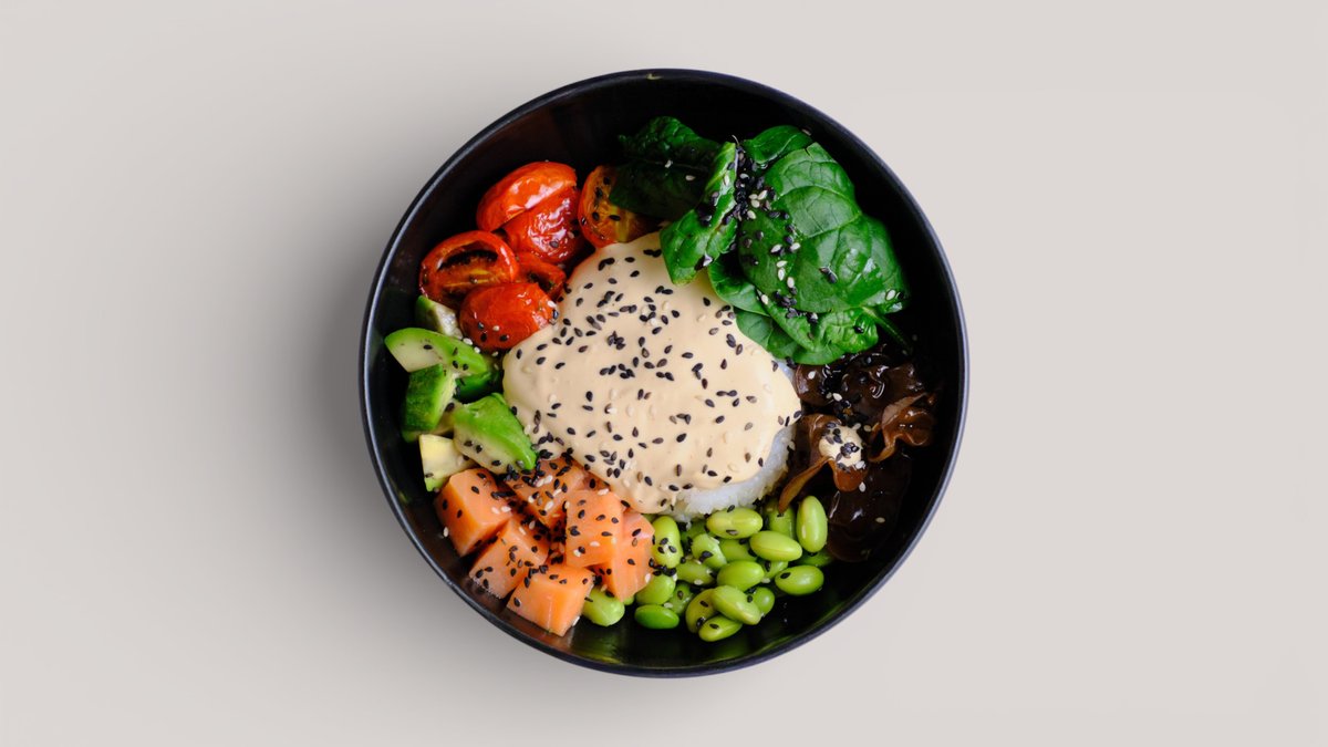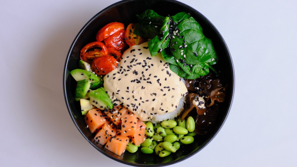 рис, киноа на выбор, соевый соус, лосось малосоленый, эдомамэ, черри, грибы древесные, авокадо, шпинат, соус айоли , кунжут