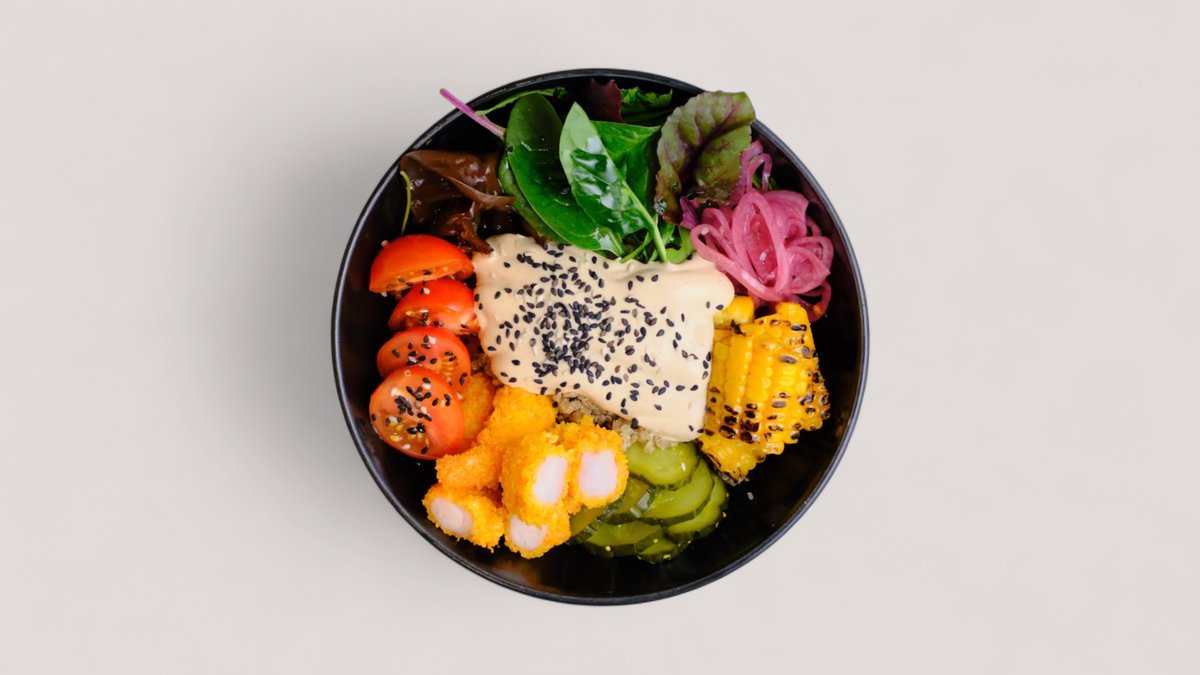 рис, киноа на выбор, креветки в панировке, соевый соус, грибы древесные, эдомамэ, помидоры черри,микс салата кукуруза жаренная айоли кунжут