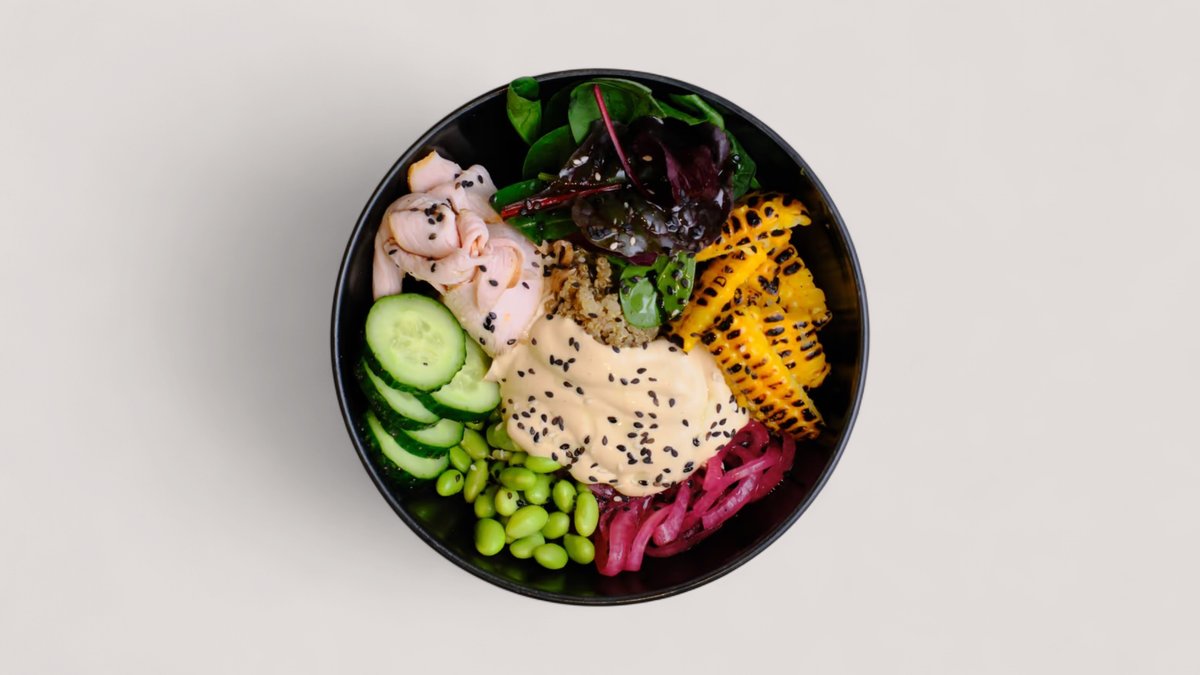 рис, киноа на выбор, эдамамэ, соевый соус, индейка, огурцы, кукуруза, лук маринованный,соус айоли, кунжут