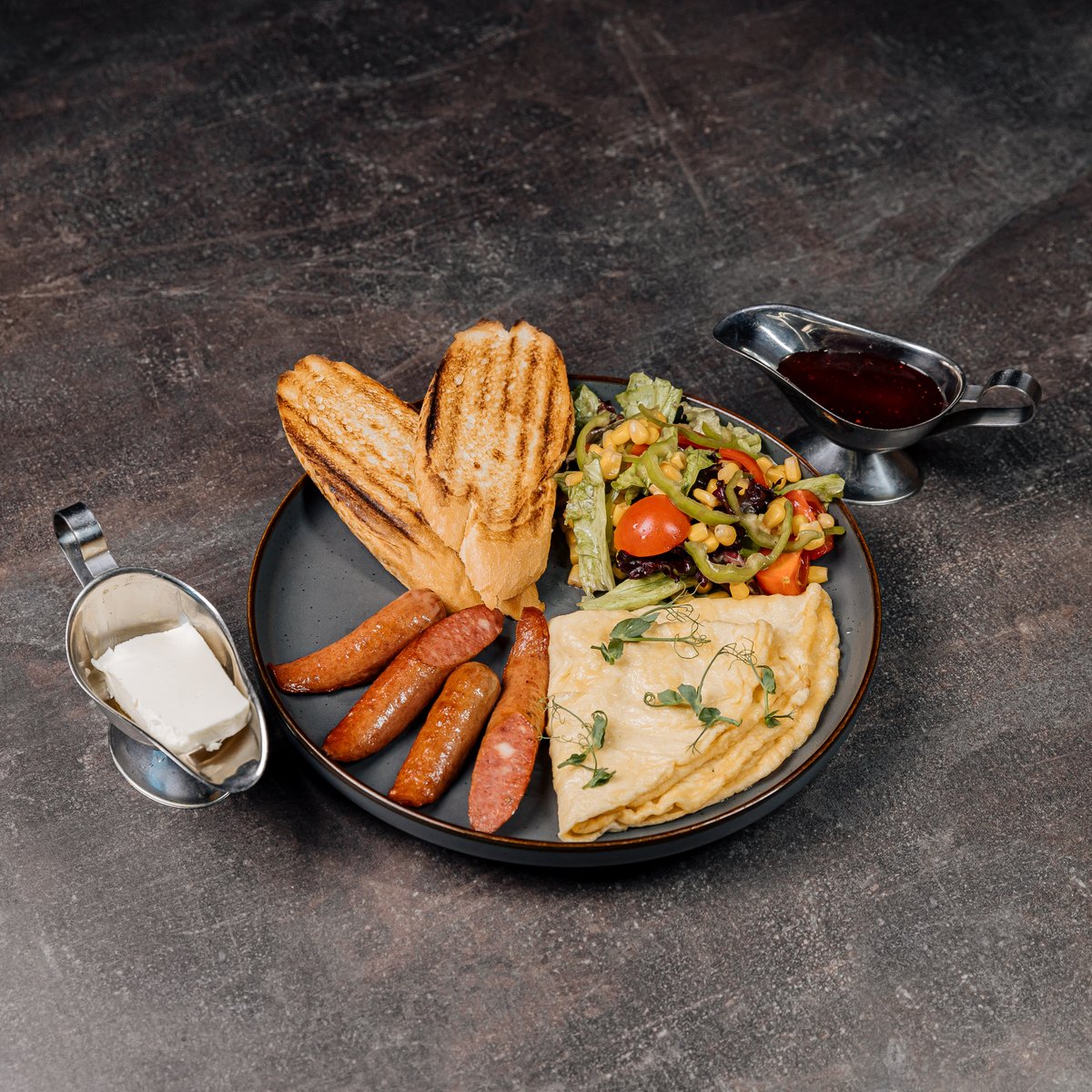 омлет из двух яиц, сосиски гриль, микс салата, брынза, хрустящий багет