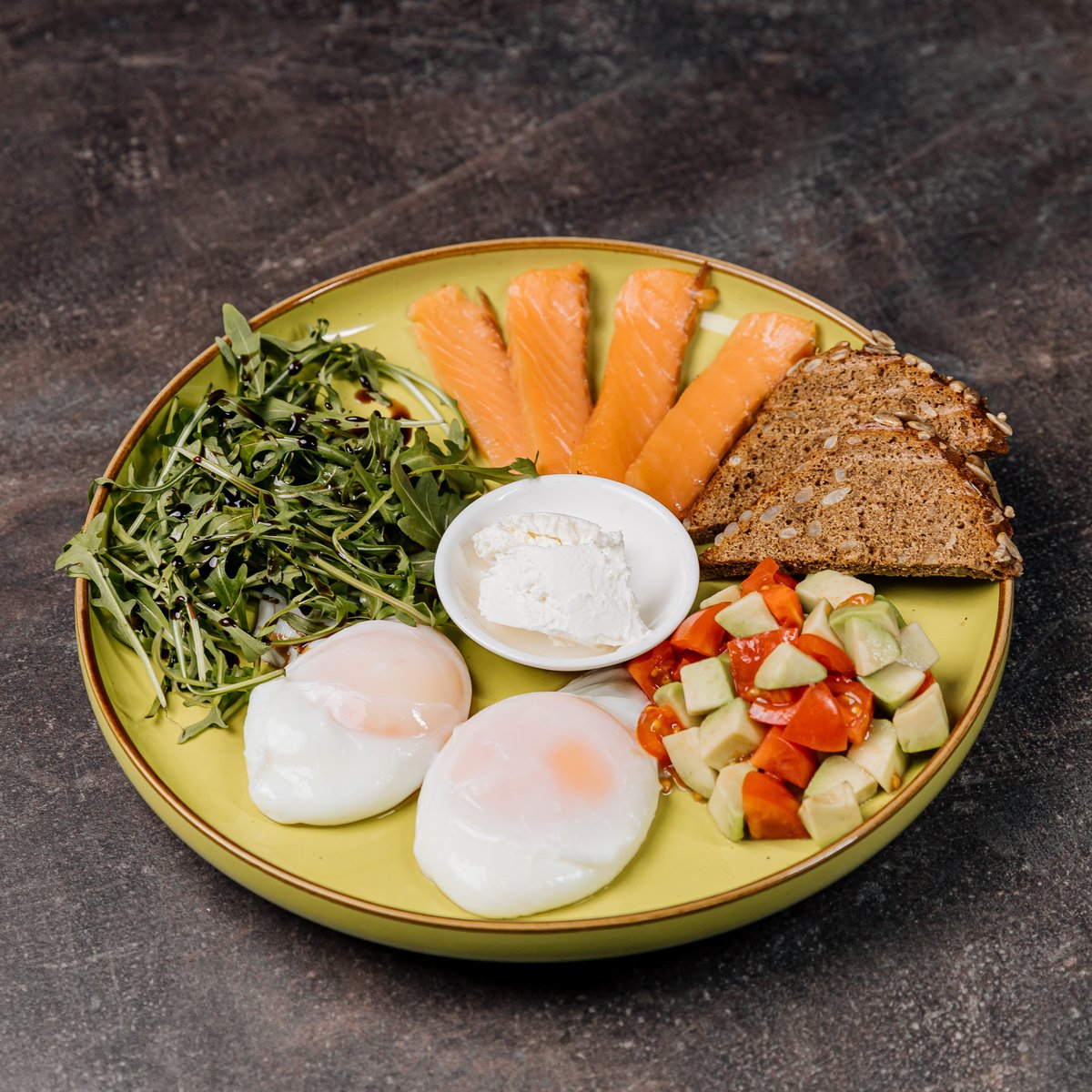 яйца пашот, малосольная семга, авокадо, помидор черри, руккола, хлеб со злаками, креметто сыр, мед