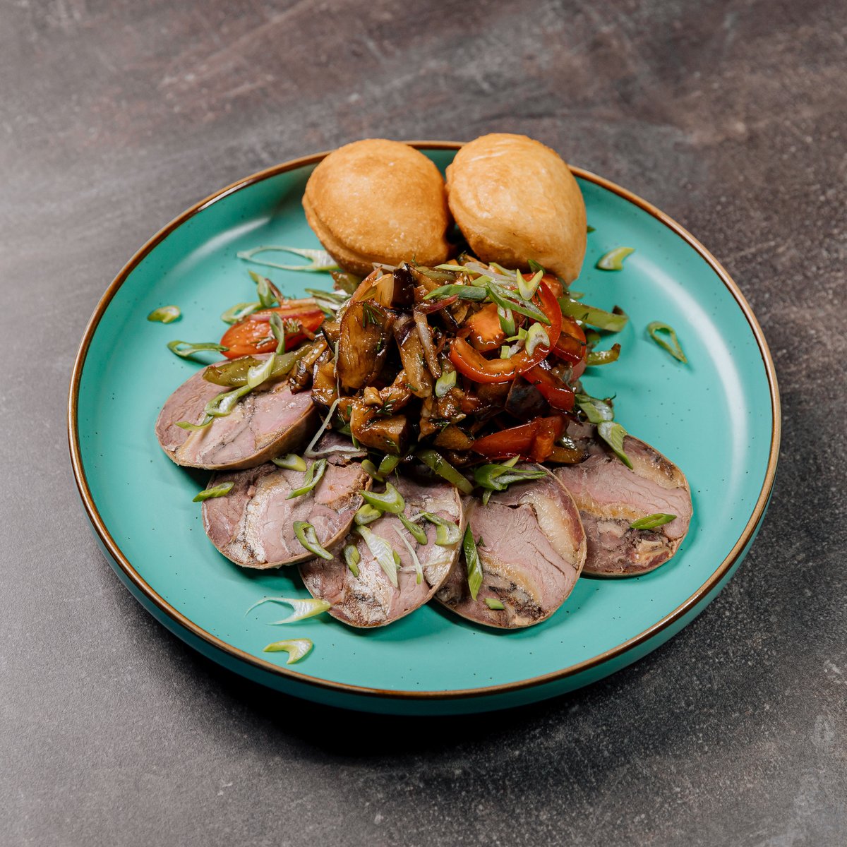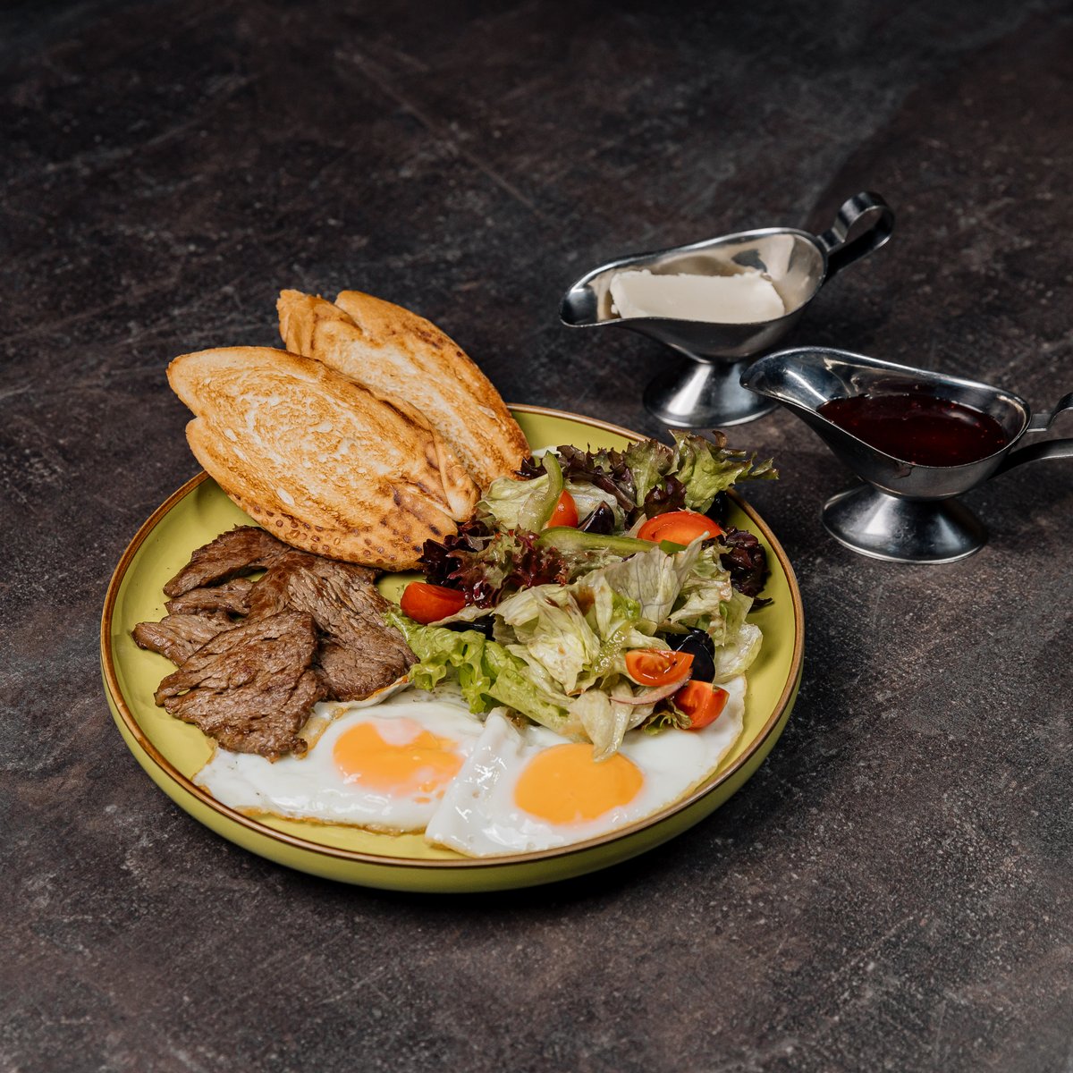 глазунья из двух яиц, медальоны из телятины, микс салат, хрустящий багет