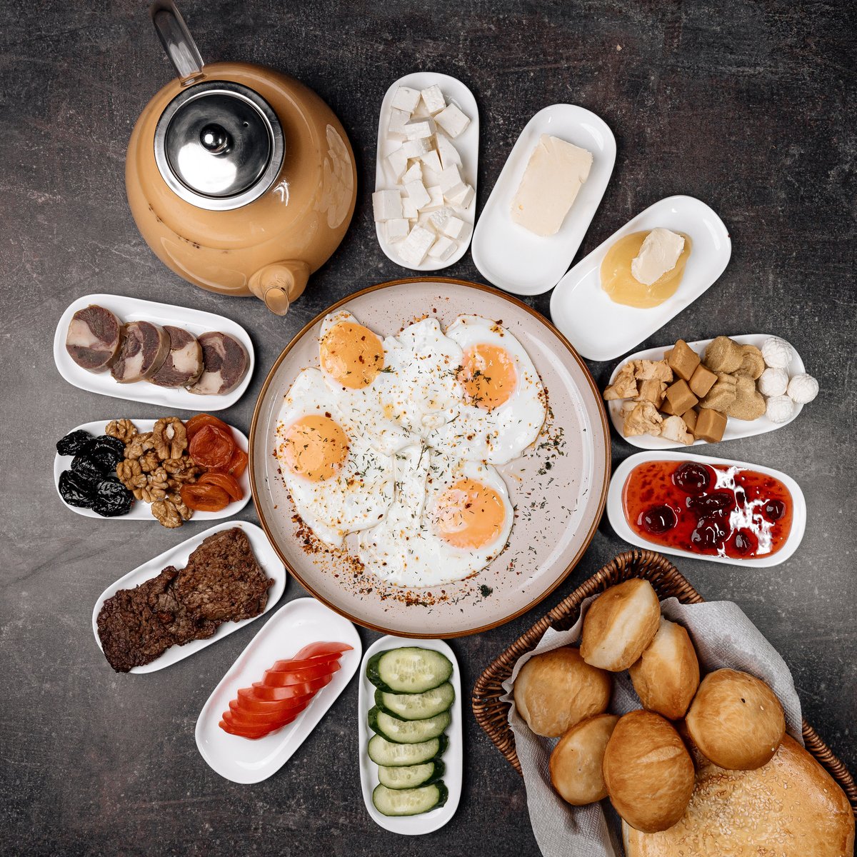 глазунья, жая, казы, сорпа, овощной салат, брынза, бауырсаки, щельпек, мед, иримшик, балкаймак, курага, финики, грецкий орех, сметана, мед, масло