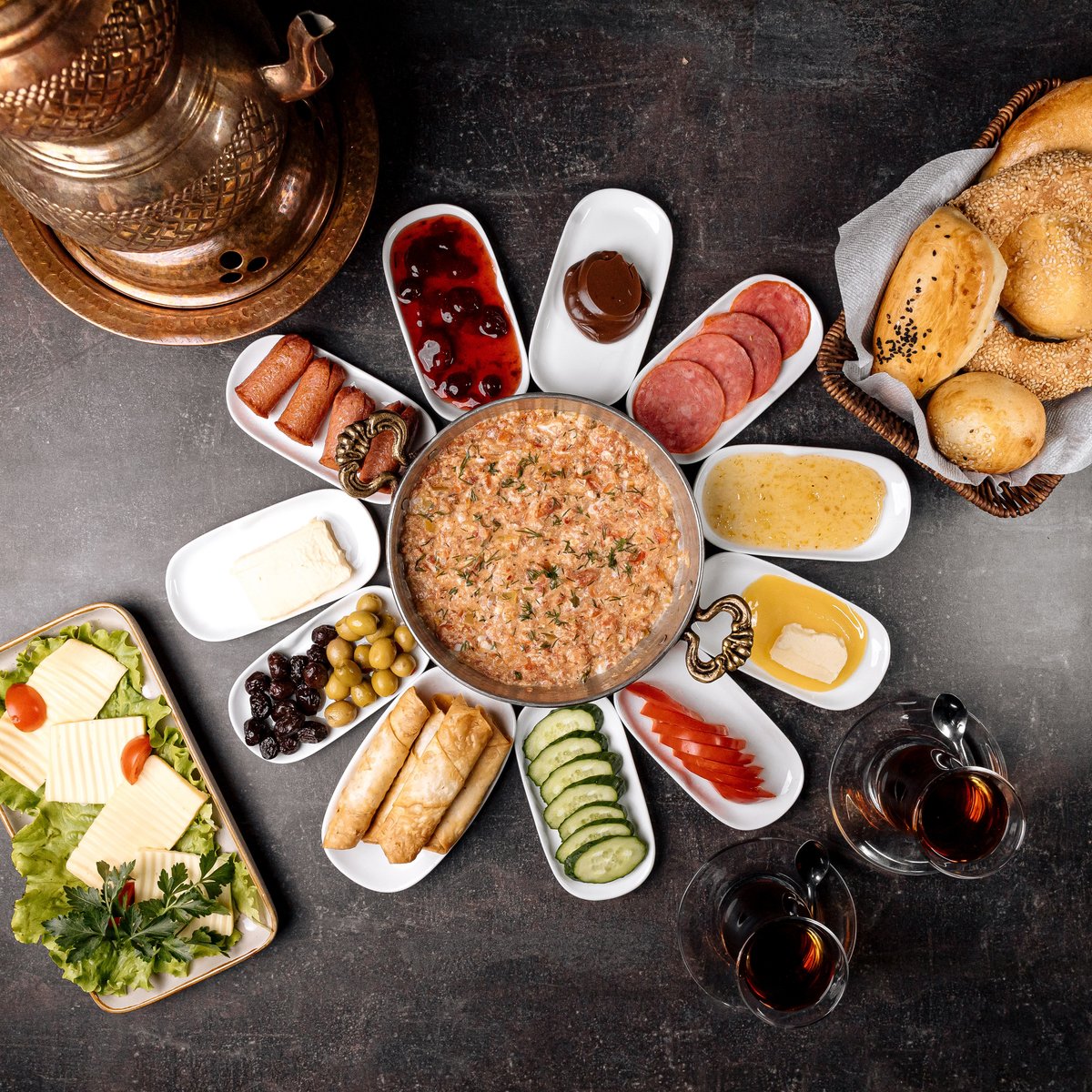 менемен, сосиски, колбаса, сыр, помидор, огурцы, сигара борек, картофель фри, оливки, мед, масло, джем, выпечка