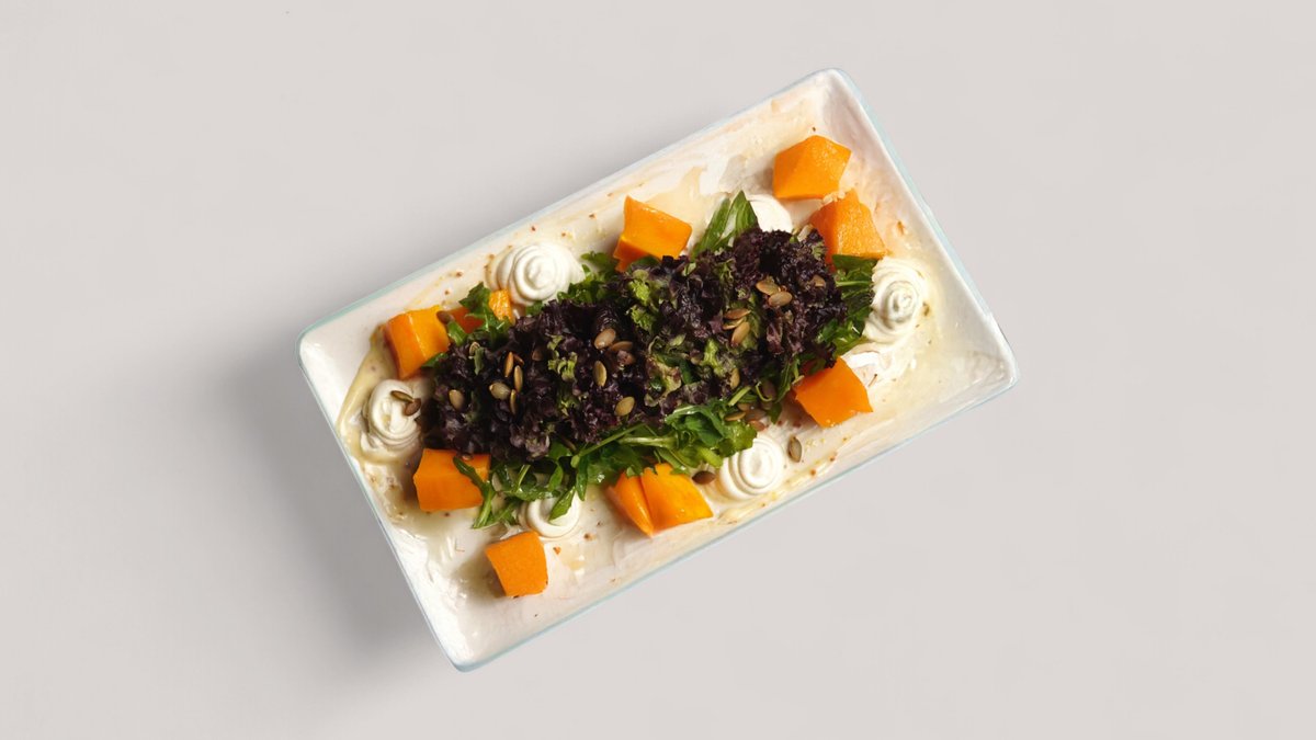 печеная тыква, микс салатов, медовый соус, сыр кремето