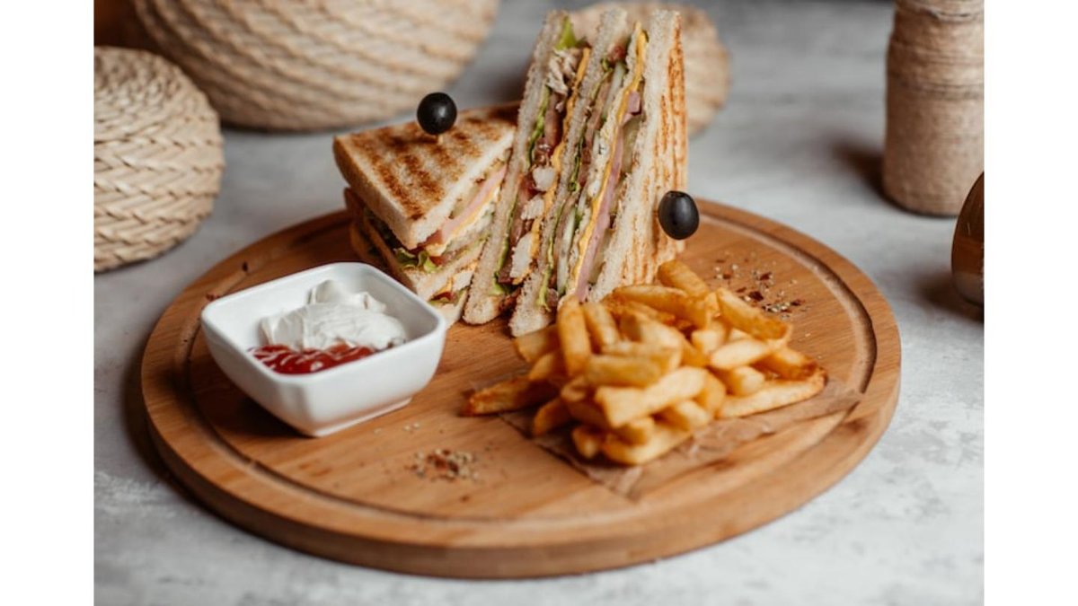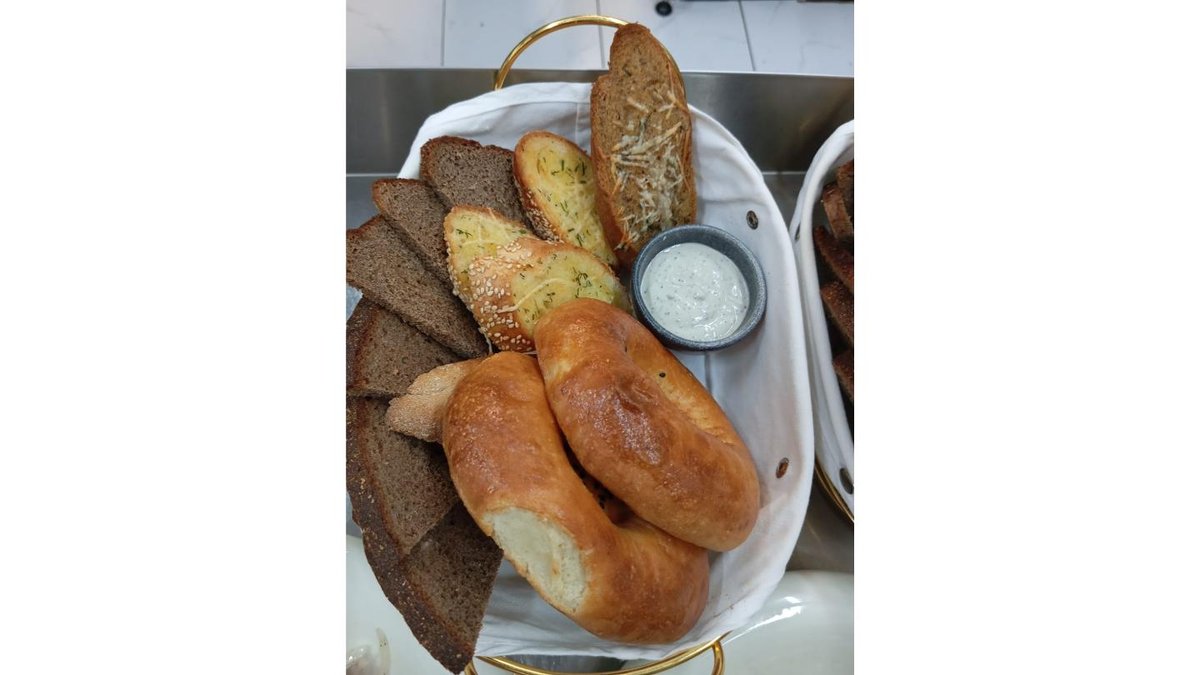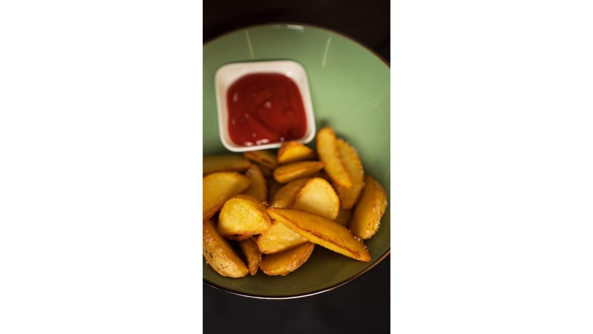 Глазуня черный хлеб помидоы черри куриные колбаски огурцы корнишоны дольки картофеля соус сметано чесночный