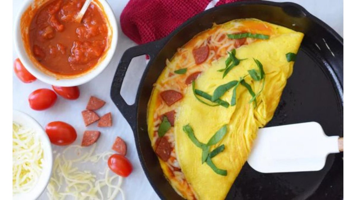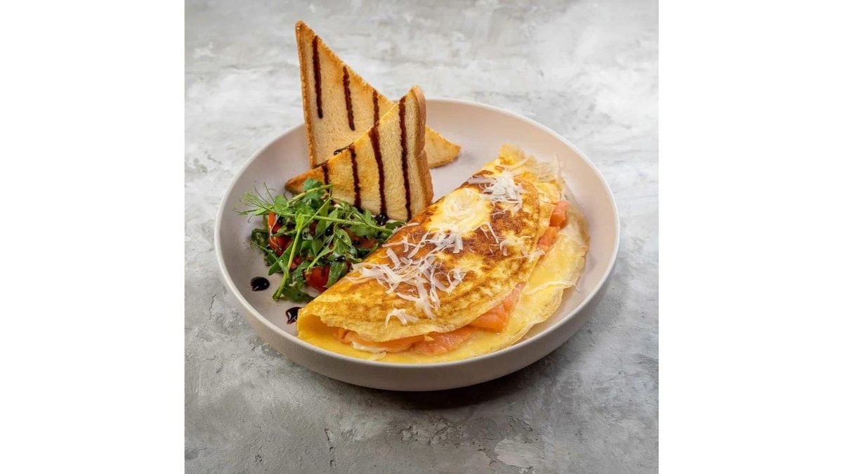 Омлет из 3 яиц с охотничьими колбасками помидоры черри микс салат тост