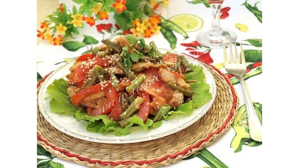 Огурцы помидоры фасоль стручковый кабачки куриное филе микс салат соус удон зелень