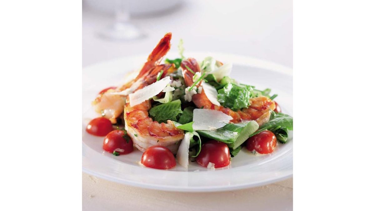 Пекинская капуста креветки тигровые помидоры черри сыр пармезан гренки