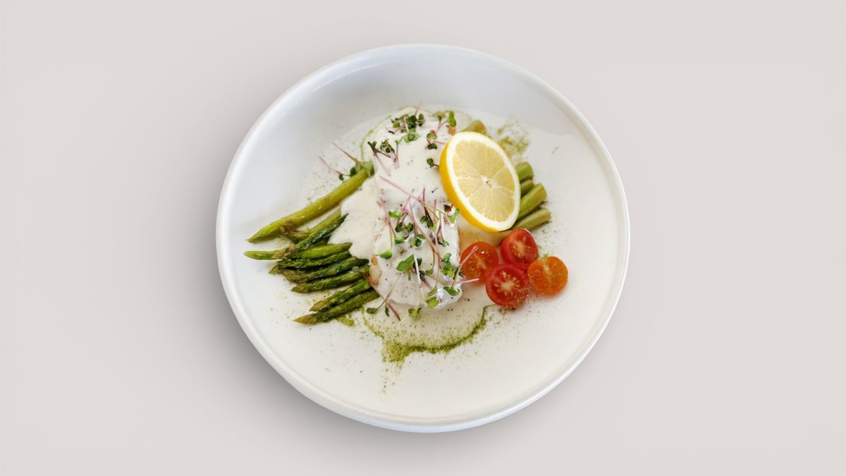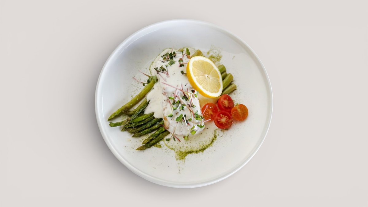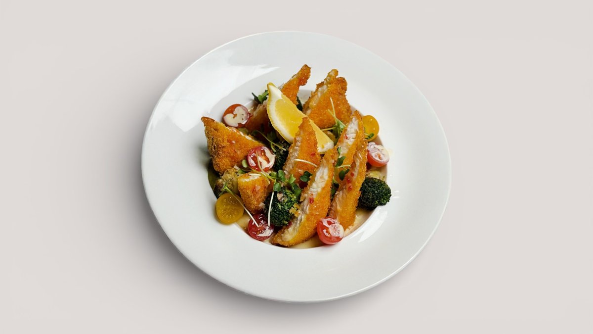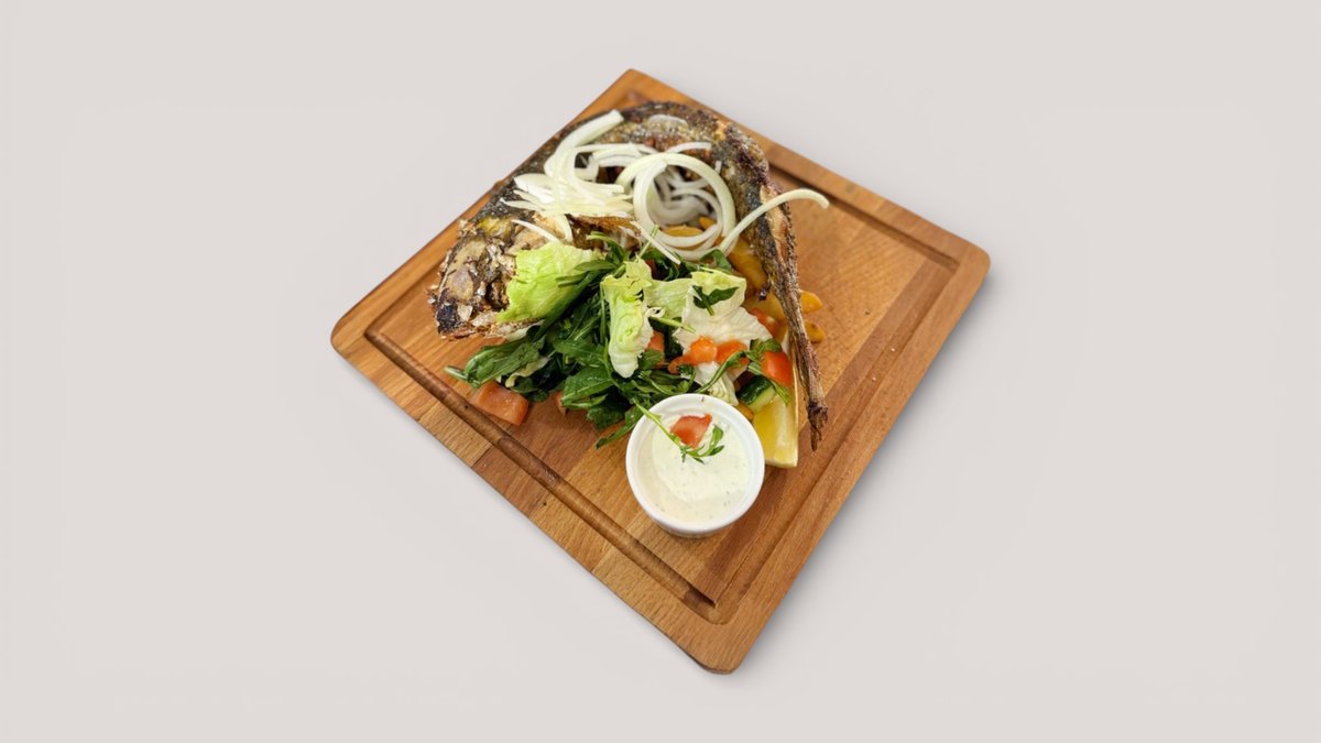Кефаль жареная целиком с картофелем по-деревенски и свежим салатом, с соусом тартар