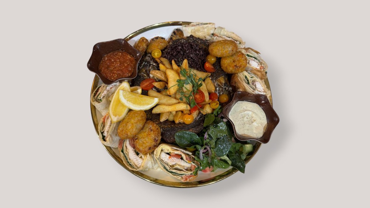 (стейк из семги – 2, жаренная кефаль -1, миди запеченные -1, судак в лаваше – 2, дорадо в панировке – 2, дикий рис, картофельные дольки)