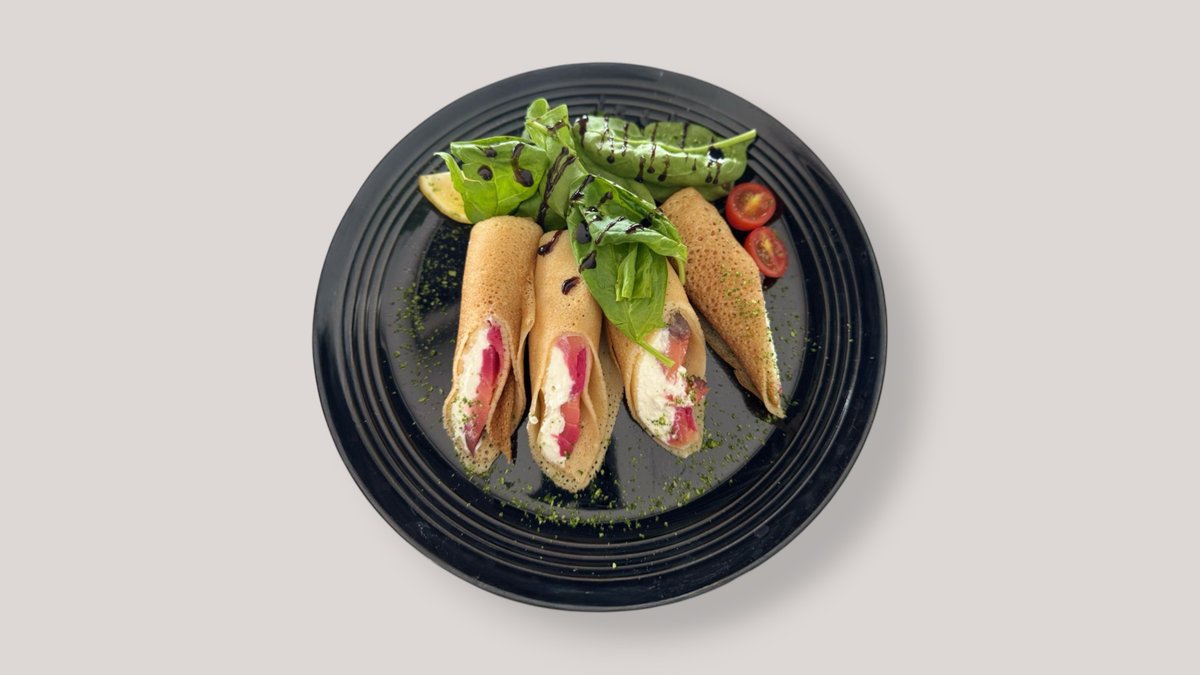 Блины домашние с семгой Гравлакс и щучей икрой с творожным сыром и шпинатом