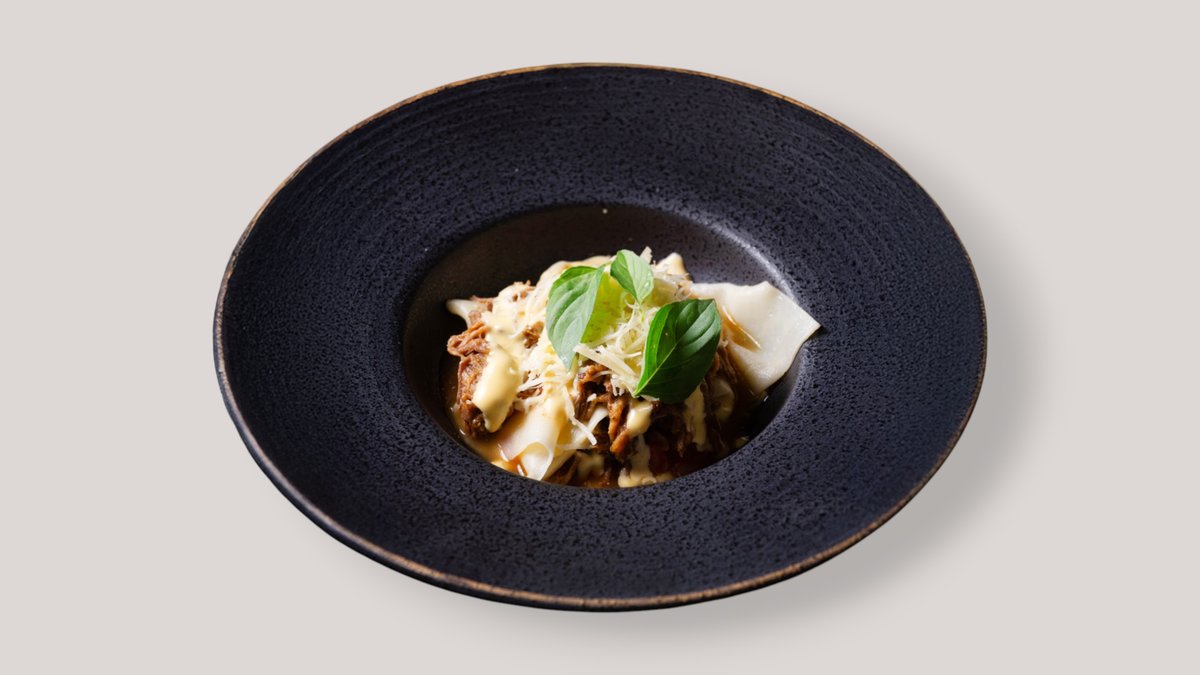 Бриошь с копченной говядиной, сырным соусом и яйцом пашот
