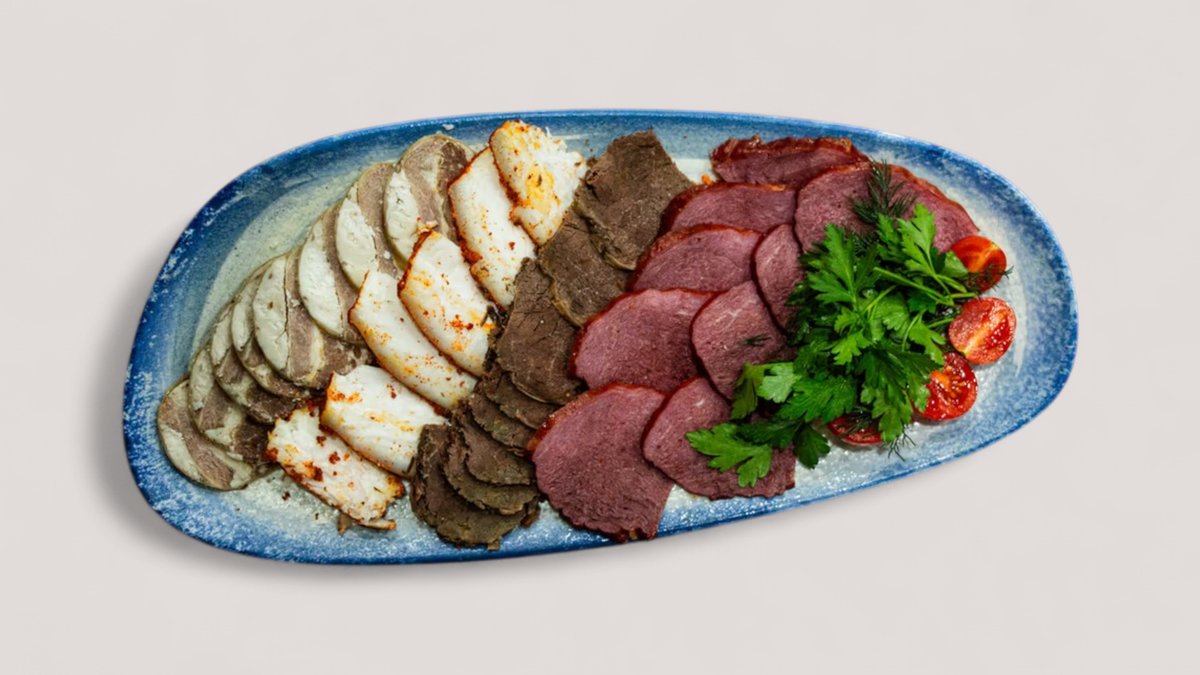 Казы, говядина копченая, говяжий язык, жая, свежая зелень, оливки, маслины и помидоры черри