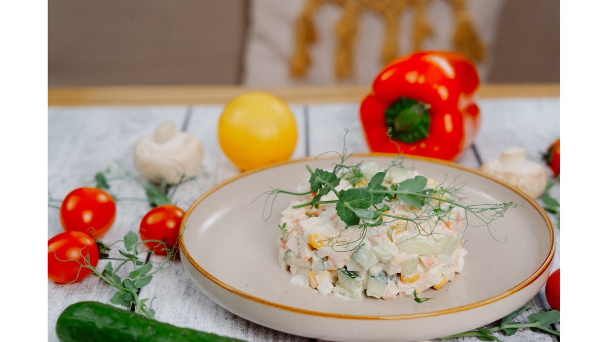 Крабовые палочки,кукуруза,яйцо,свежие огурцы.