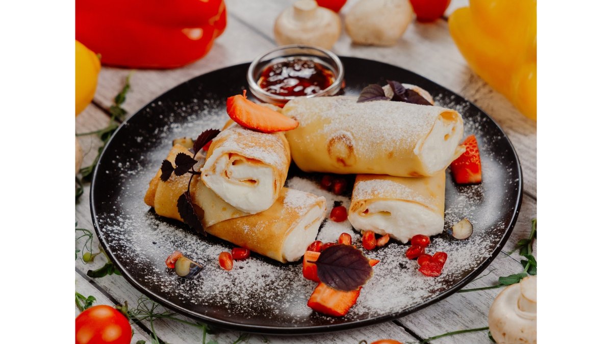 Блин,творог,сахарная пудра,клубника,малина.
