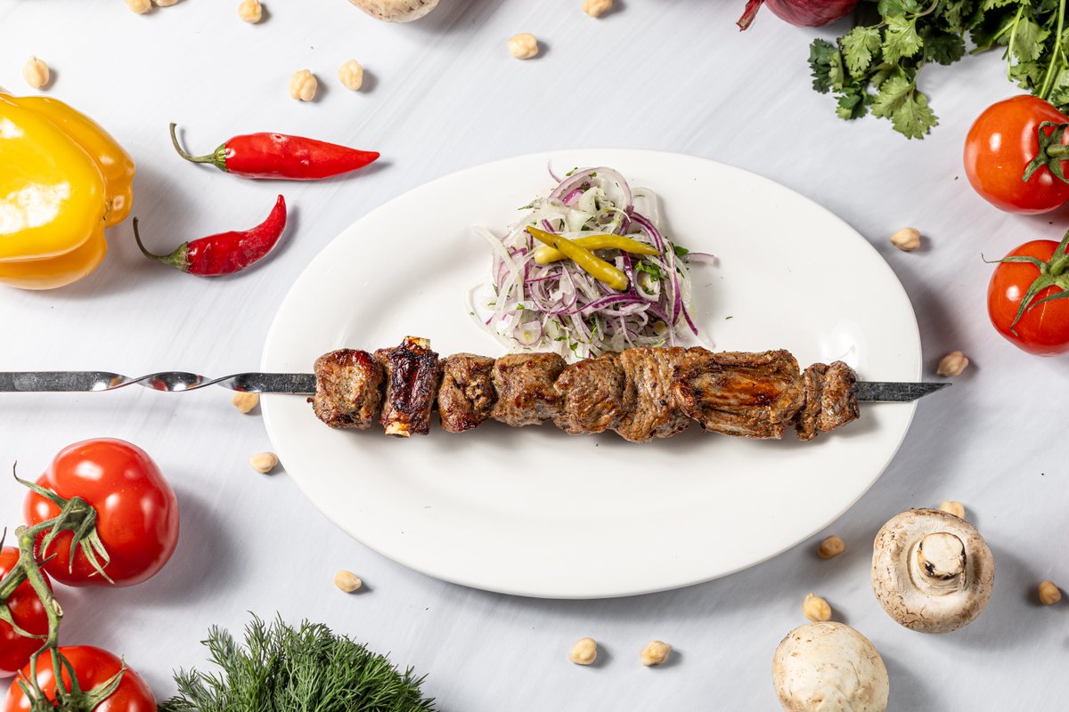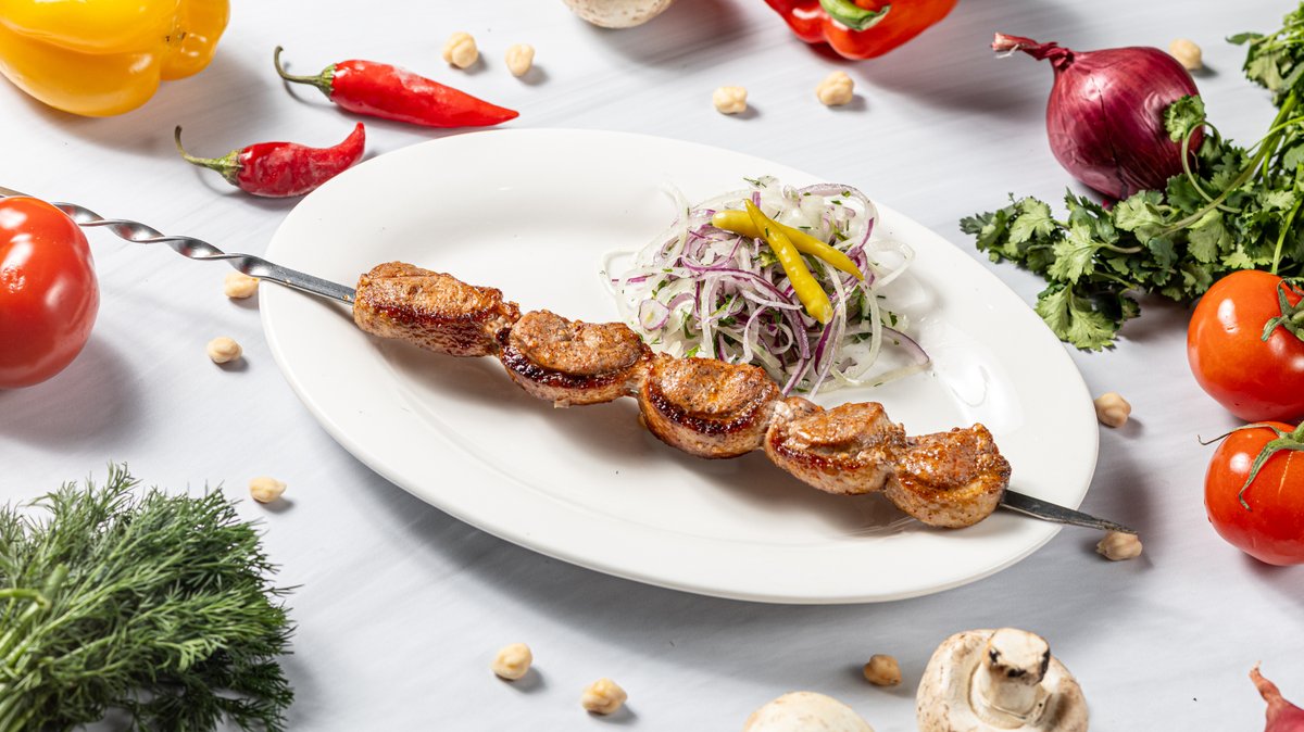 Классический шашлык из сочной баранины, замаринованной в ароматных специях и луке. Крупные кусочки мяса обжариваются на углях до румяной корочки, оставаясь мягкими и нежными внутри.