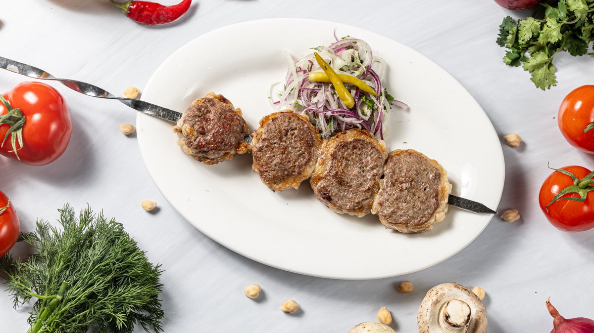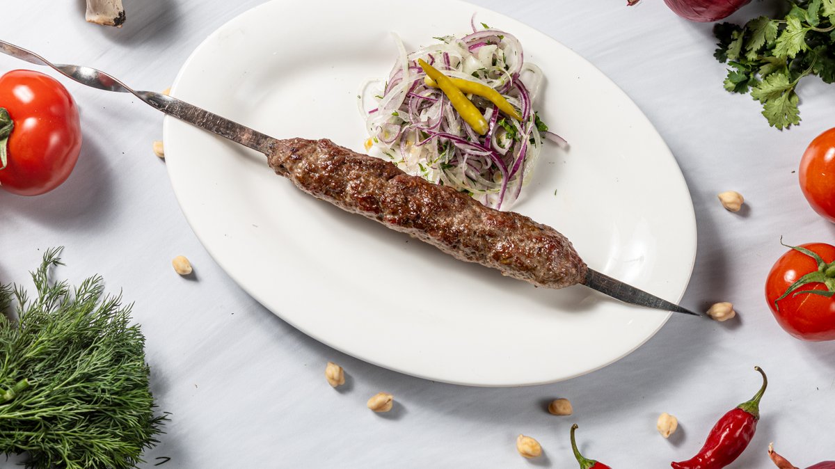 Сочный и насыщенный кусочек восточного удовольствия. Нежная смесь фарша из говядины и баранины, пропитанная ароматными специями, обернута тонким слоем бараньего жира для сохранения сочности и утонченного вкуса. Обжаривается на открытом огне, что придает блюду аппетитную корочку и характерный дымный аромат.