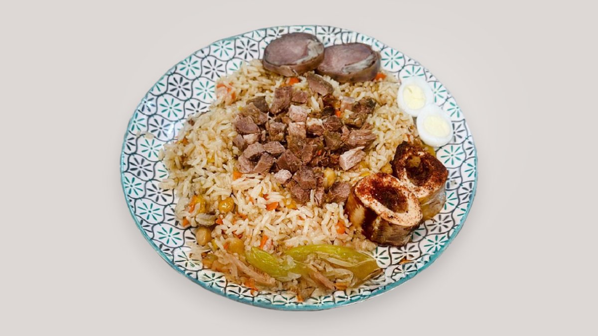 Баранина, казы, перепелка,Рис, морковь, желтая морковь, изюм, нут