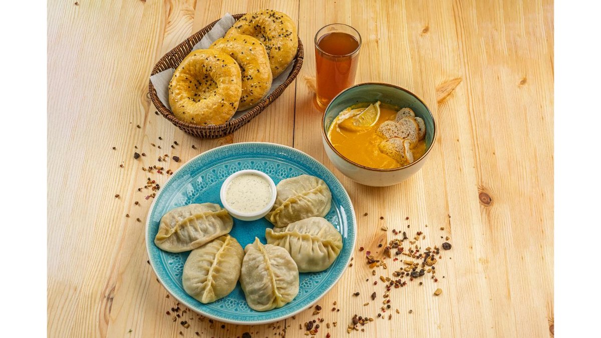 Сет из первого (чечевичный, куриный) и второго блюда (манты), салат винегрет, лепешка, финики, по стакану воды и компота