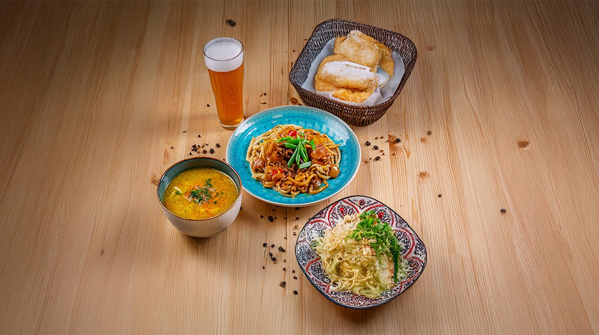 Лагман, Куриный суп, Салат оливье, Лепешка, Компот