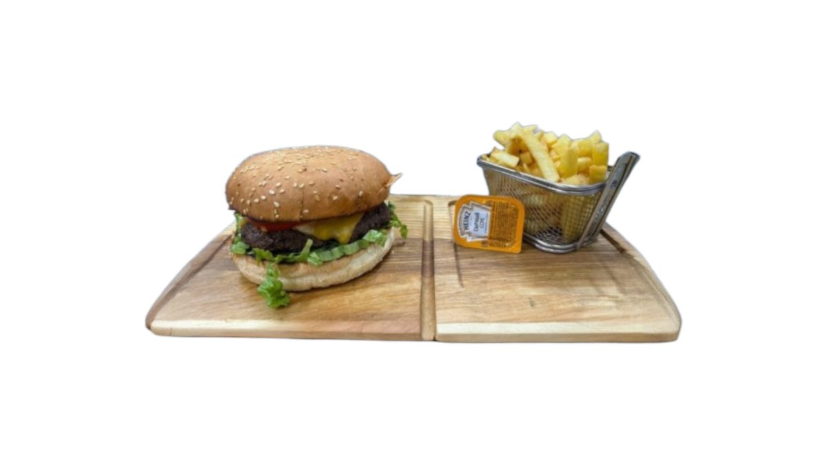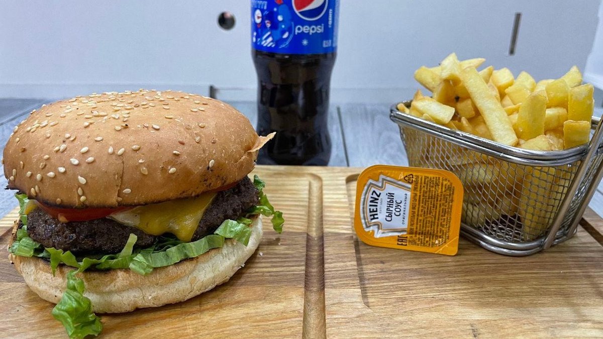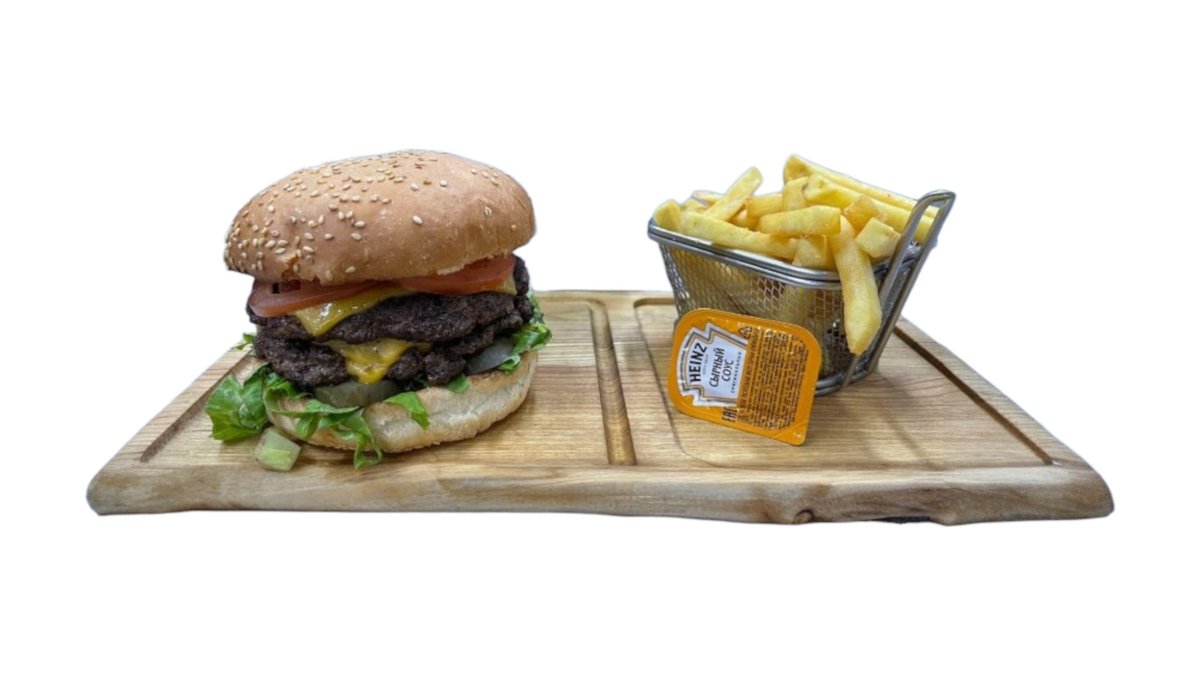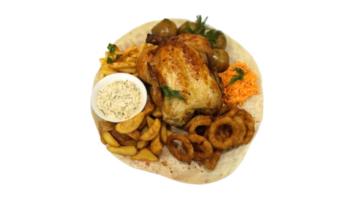 Курица гриль, лаваш, салат Свежий, белый соус, фри, картофельные дольки, луковые кольца.