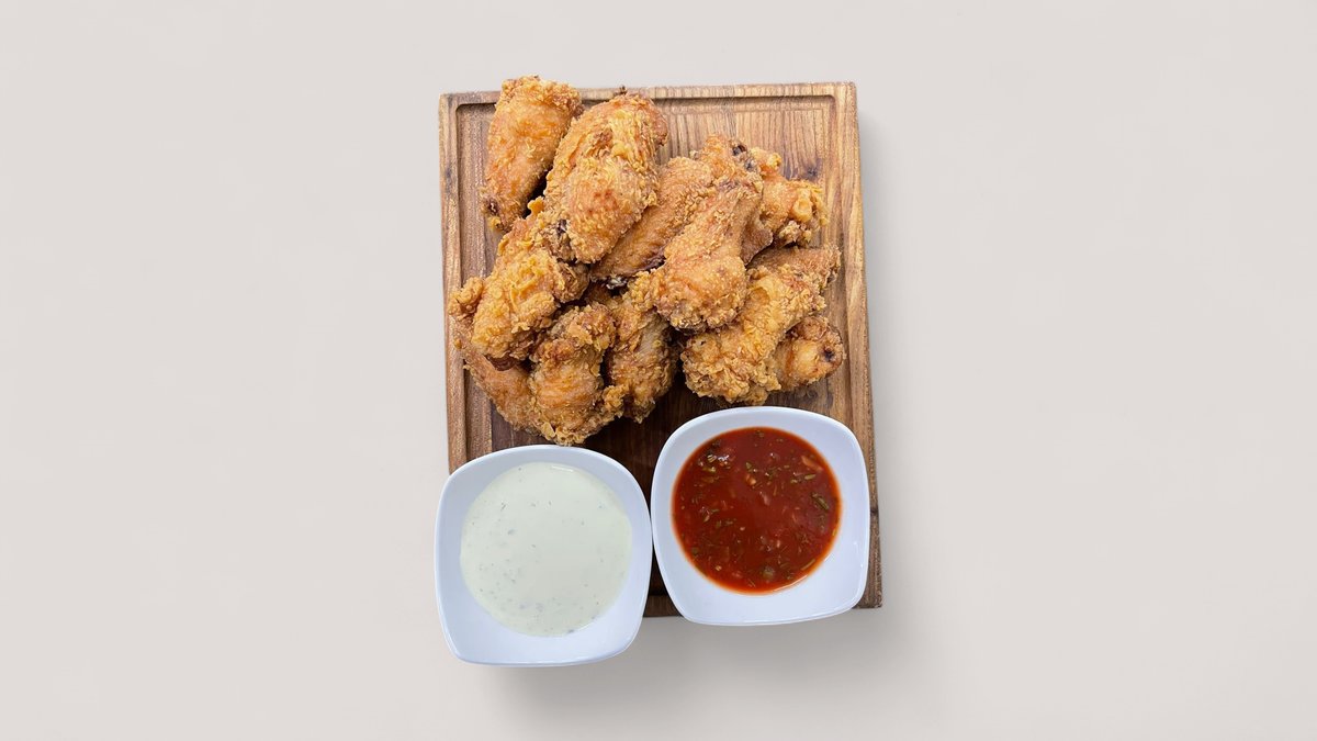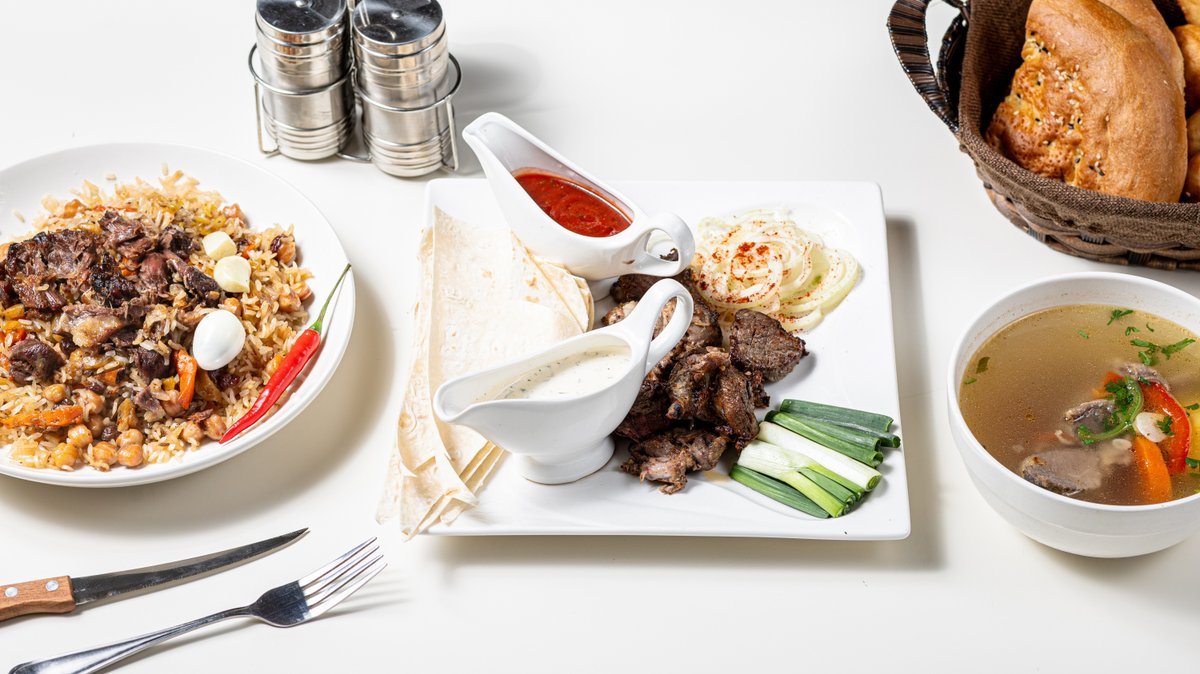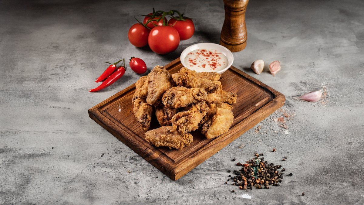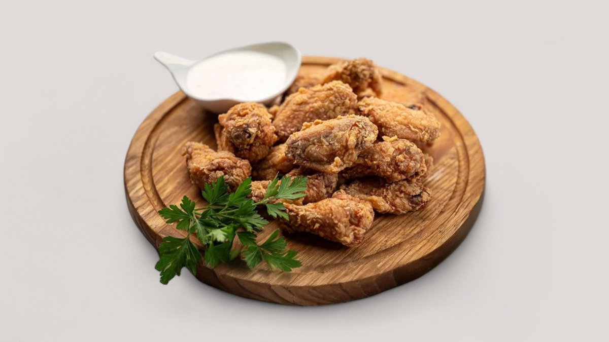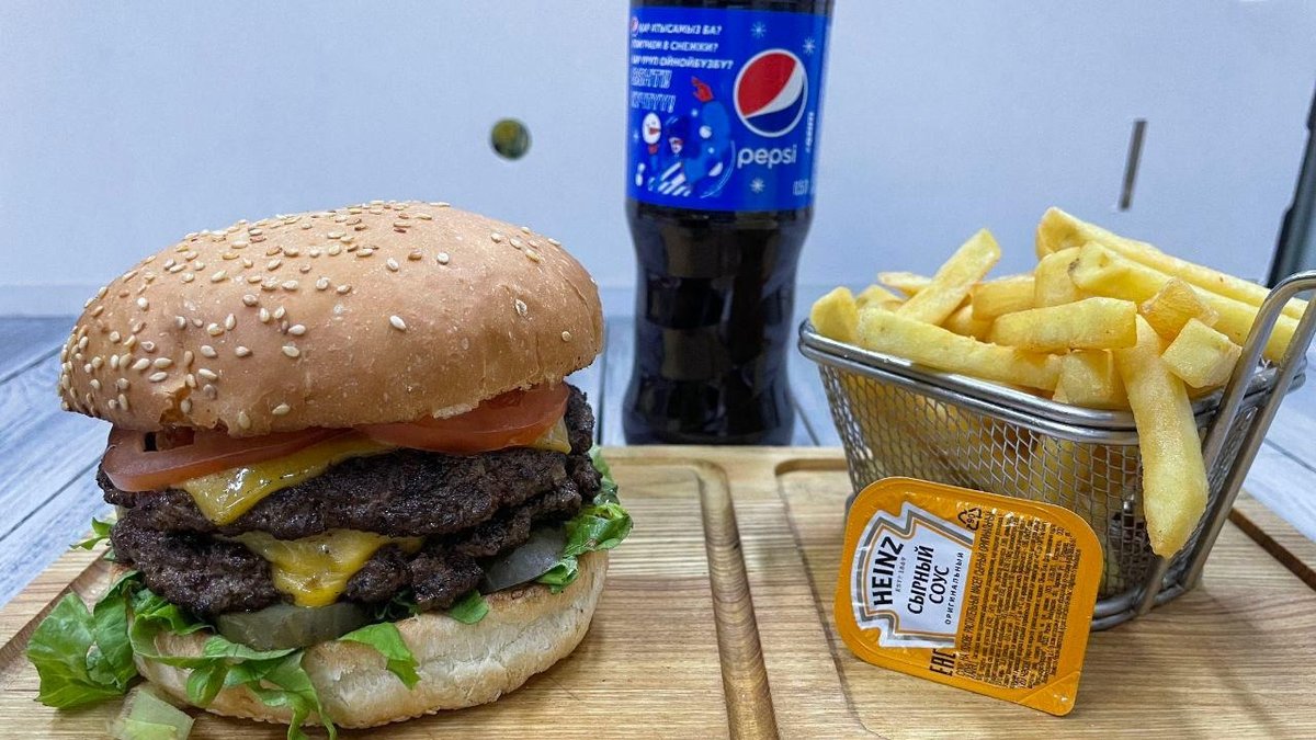Курица гриль, лаваш, салат Свежий, белый соус, фри, картофельные дольки, луковые кольца.
