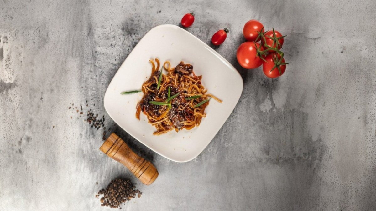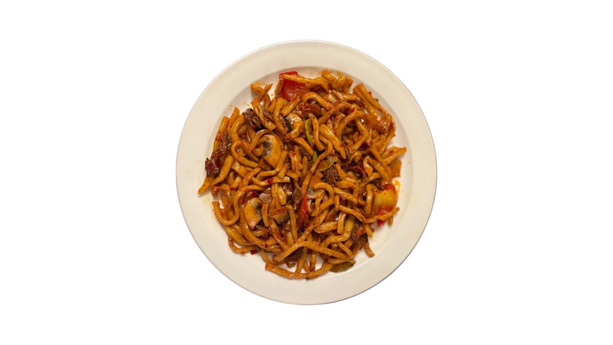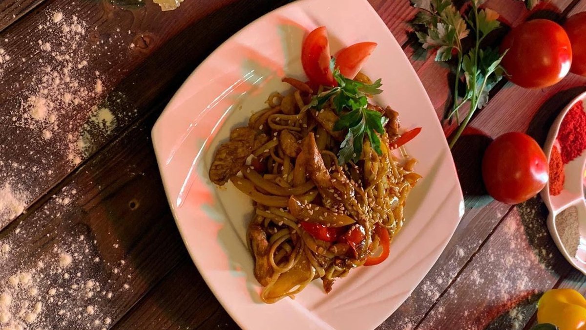 Мясо говядины, болгарский перец, стебель сельдерея, пекинская капуста, лагман жареный