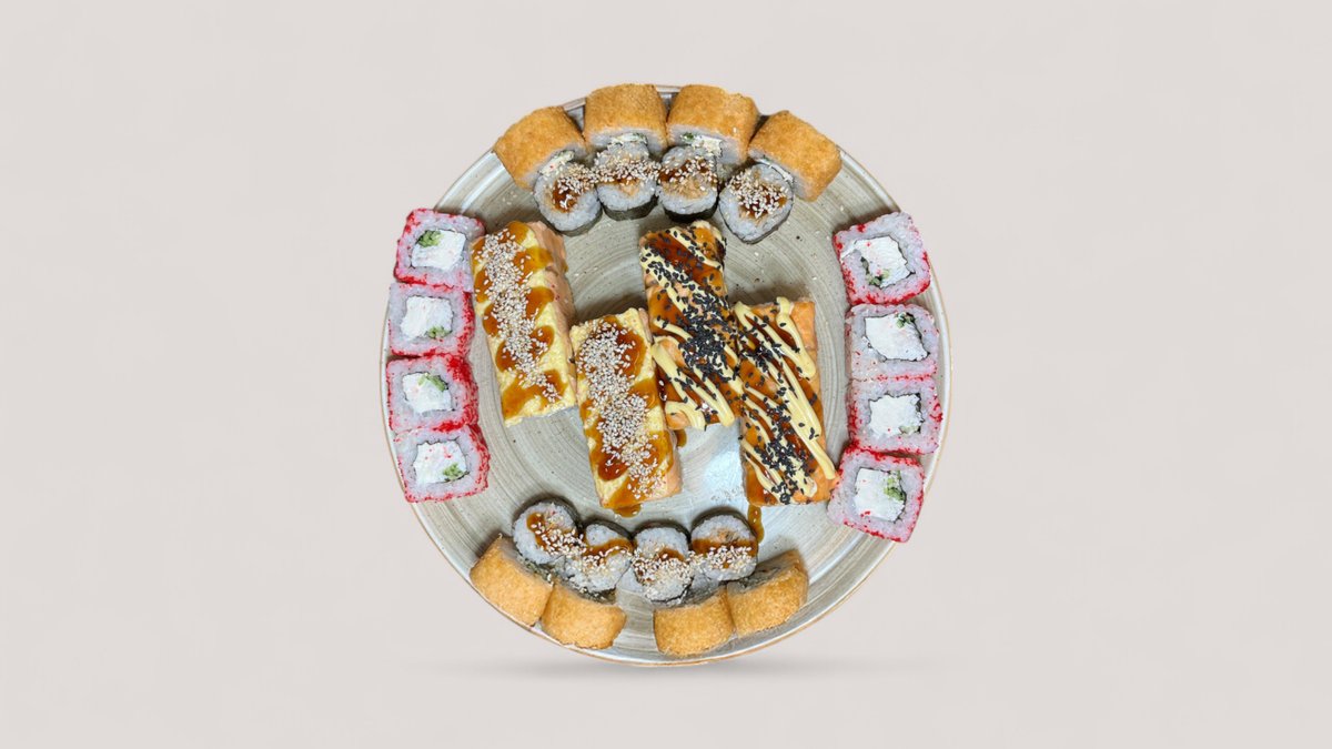 Поцелуй гейши, Обжорик ролл, Калифорния ролл, Филадельфия темпура, Ролл с угрем. 40шт.