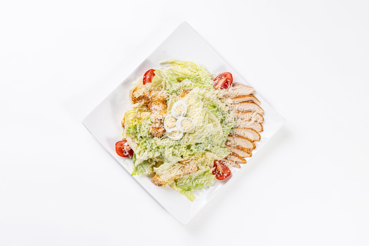 Курица, салат айсберг, сухарики, соус цезарь, пармезан
