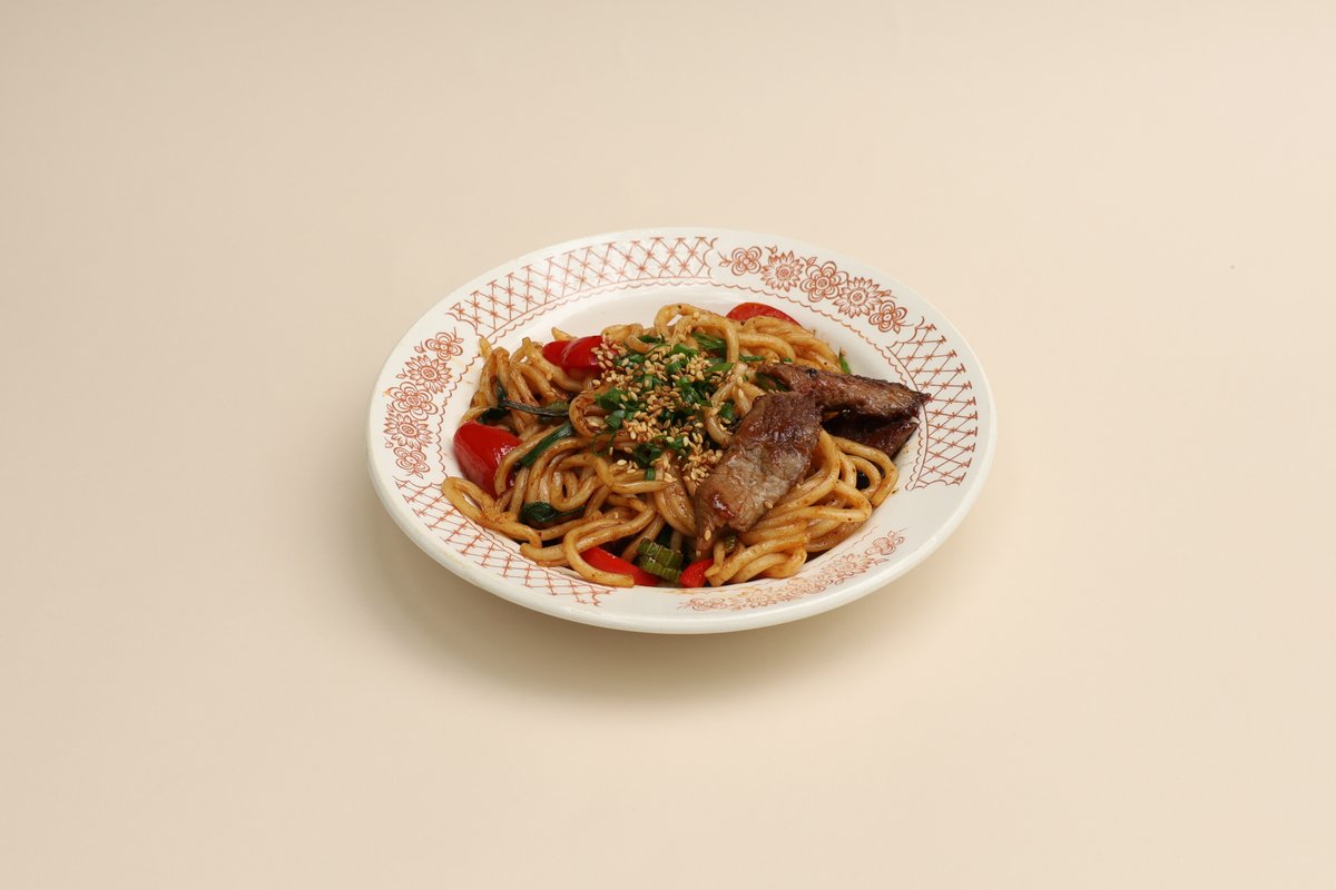 Домашняя лапша вок с тонко нарезанным сельдереем, болгарским перцем, говядиной, черри и зеленым луком.