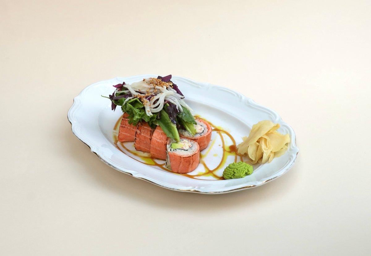 Обожженный лосось, креветка темпура, огурец, терияки-майо, рис, нори, микс салата и дайкон.