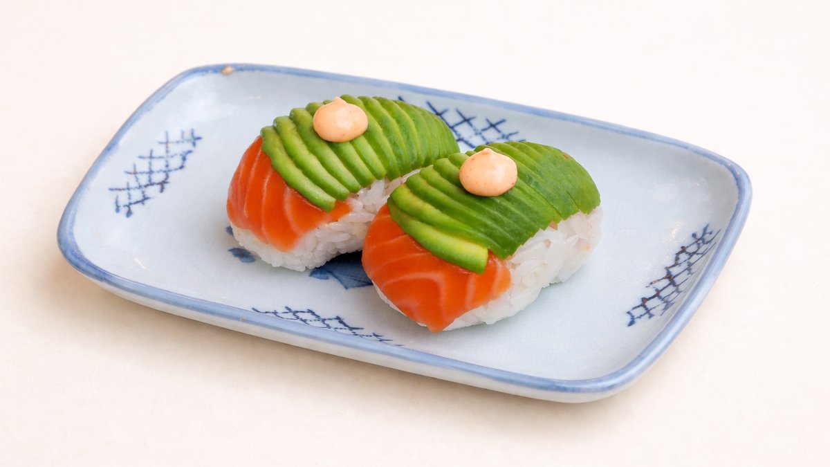 Опаленный лосось зуке с юдзу-крабом и авокадо