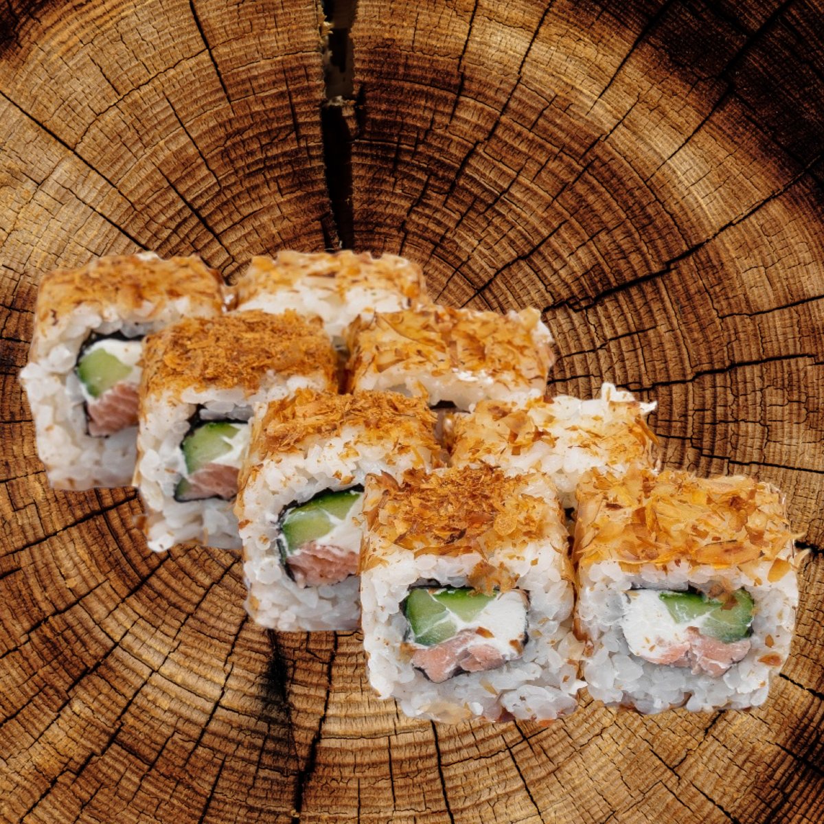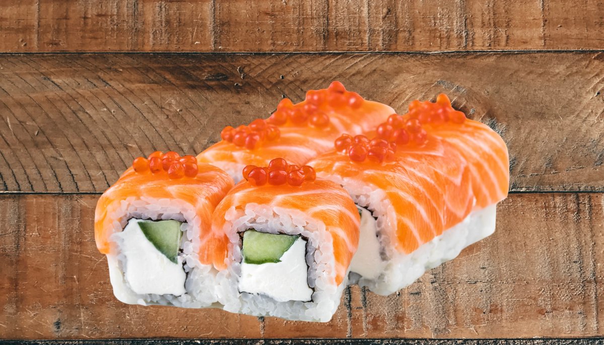 лосось в соусе терияки. стружка тунца филадельфия, огурец, тобико.