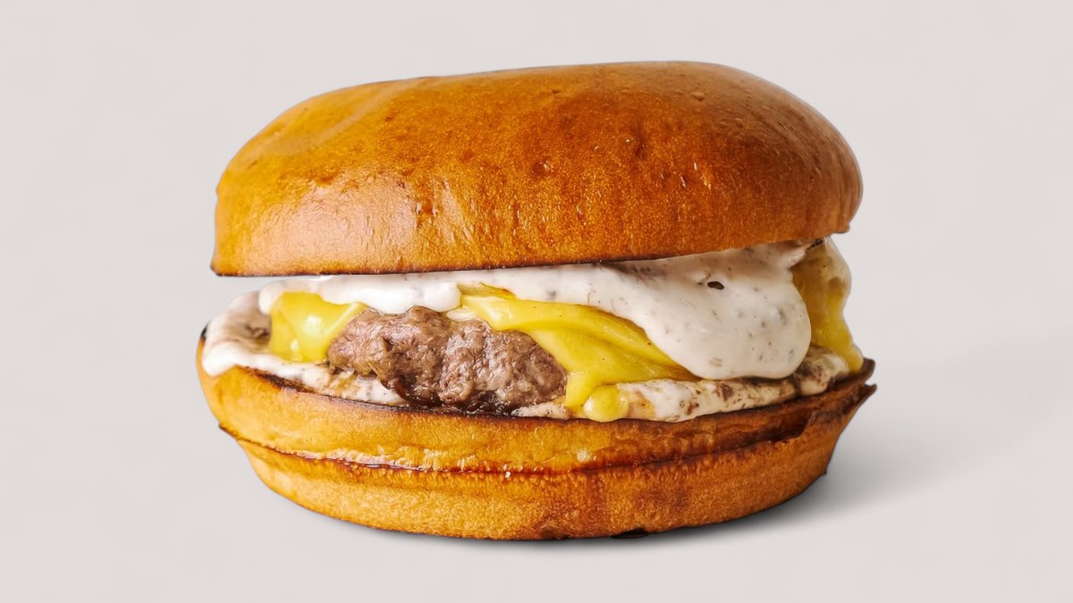 Булочка бриошь ,трбфелный соус ,лук карамель ,котлета из мраморной говядины ,чеддер .