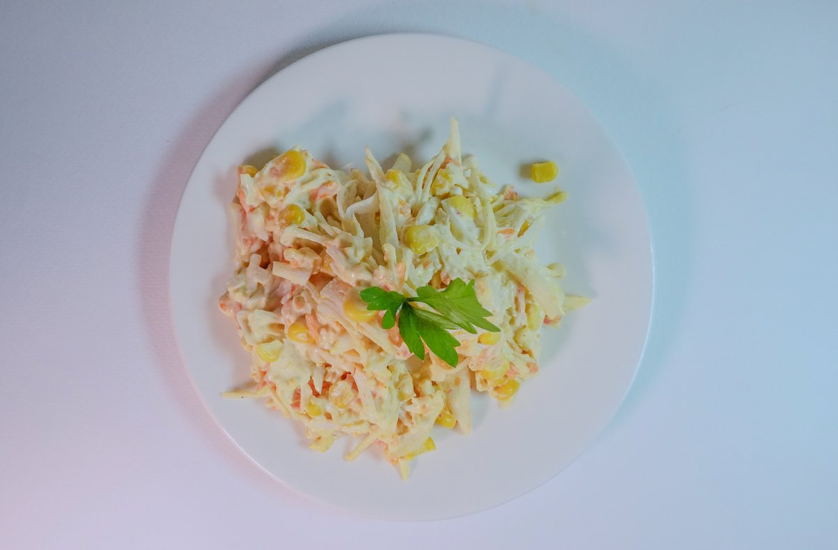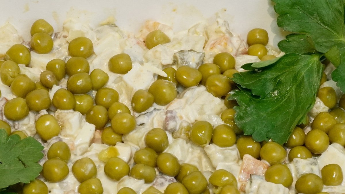 традиционный салат из отварных овощей, свежего лука и говядины, заправленный майонезом