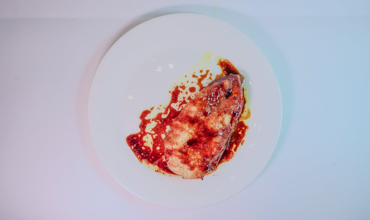 ролл с лососем, творожным сыром и авокадо политый соусом манго и посыпанный чили перцем