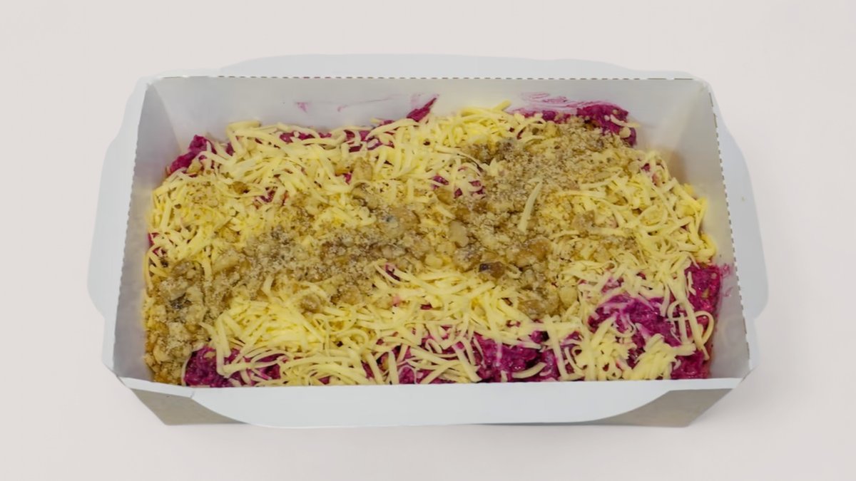 отварная тертая свекла, заправленная сыром, чесноком, грецкими орехами и майонезом