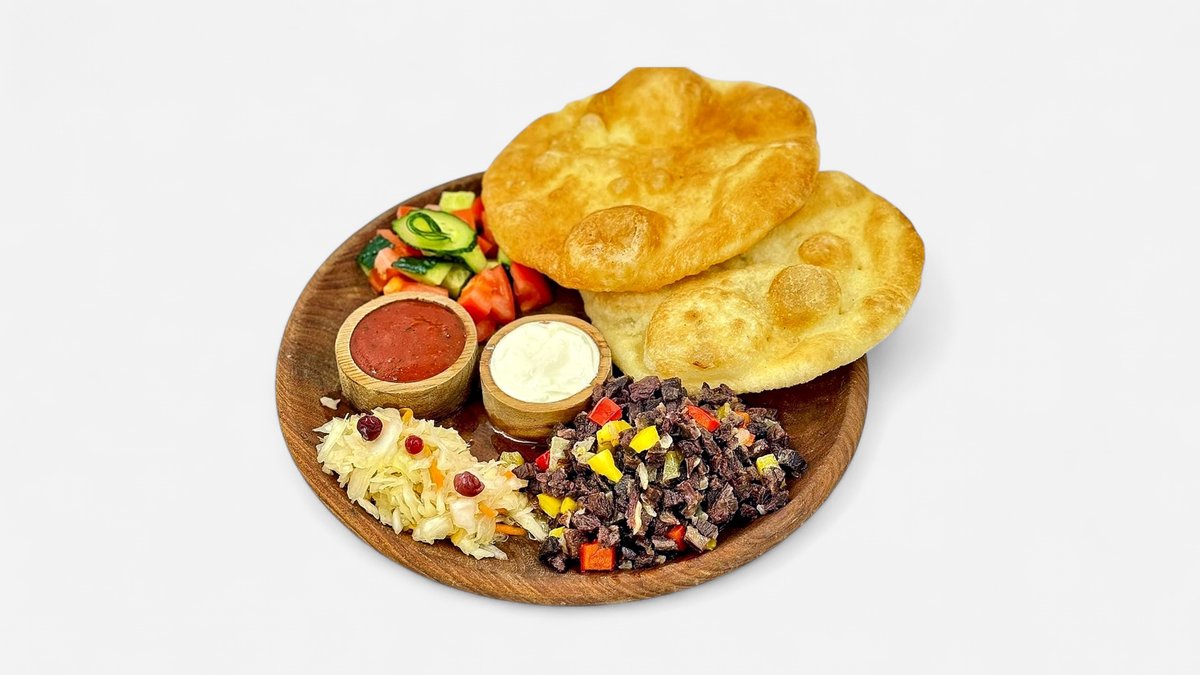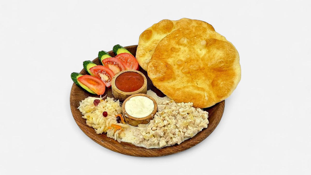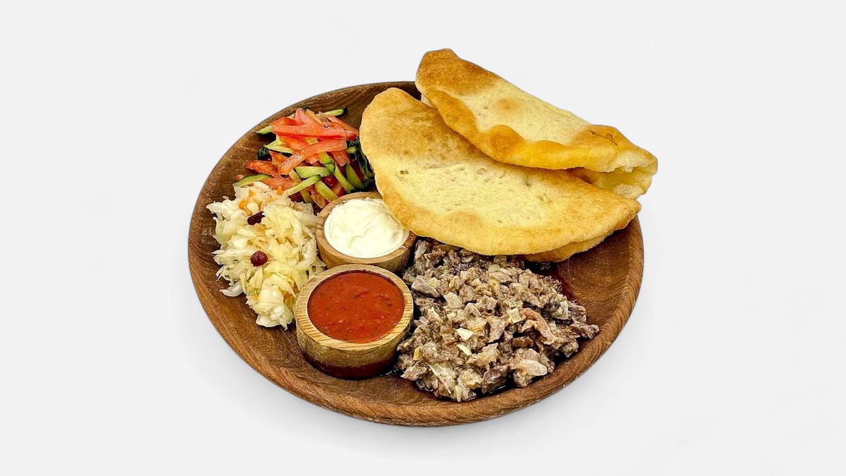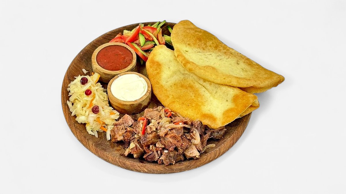 Нан бауырдак из говяжьего мяса, бульон, фри, вареный курт, перчик, соус