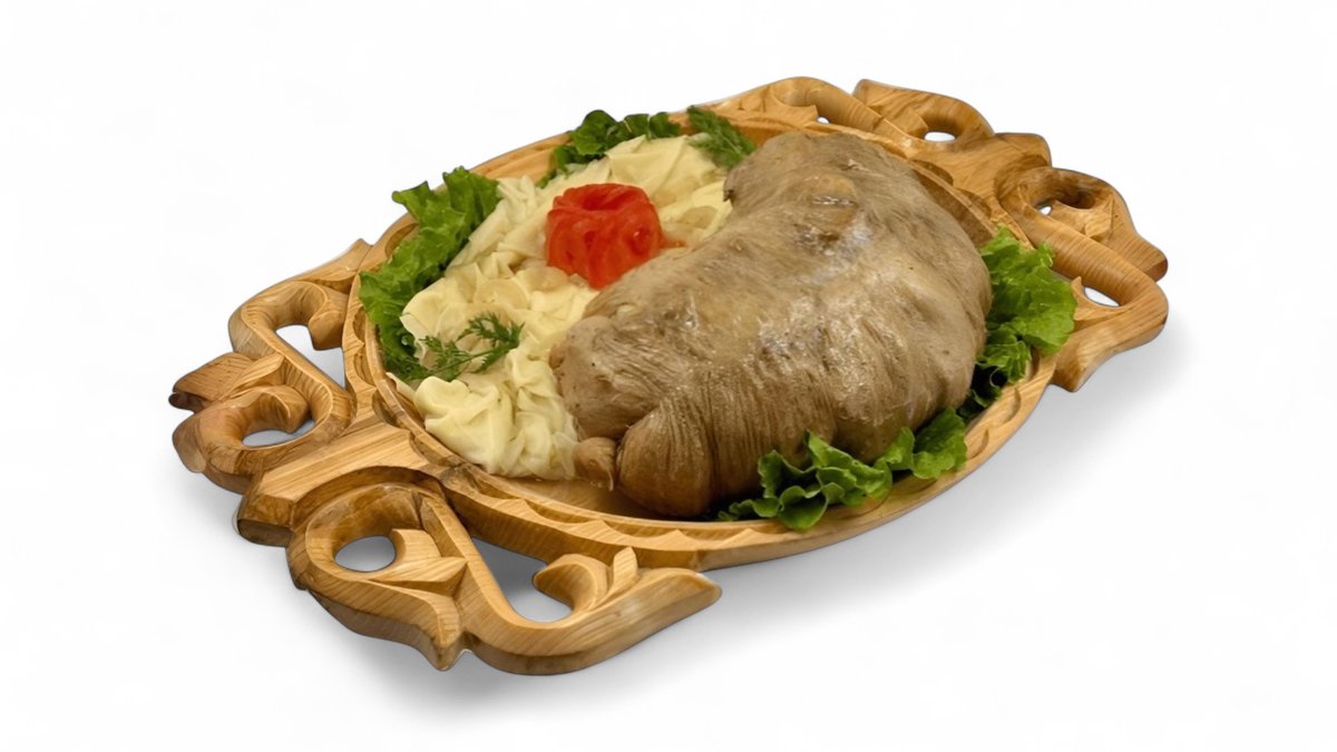 Голова ягненка, тесто, картофель, соленые огурцы, лук, кетчуп, зеленый лук