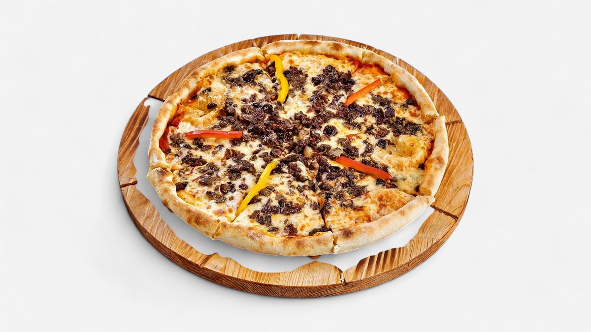 Пицца, соус, сыр, казы, мясо говядины, печень или куриное мясо