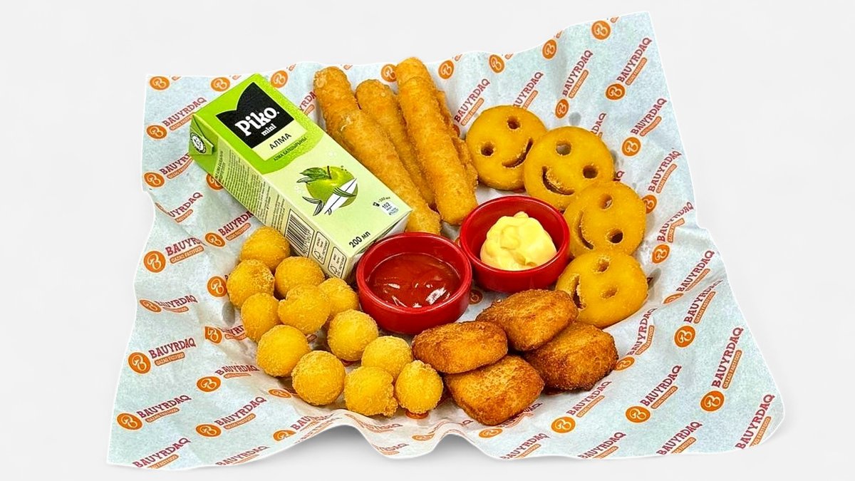 Наггетсы, картофельные шарики, сырные палочки, кетчуп, сырный соус, сок Piko, фри