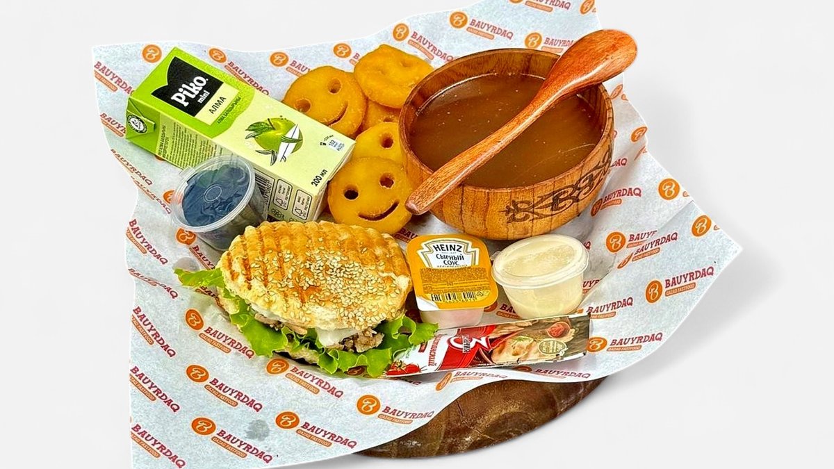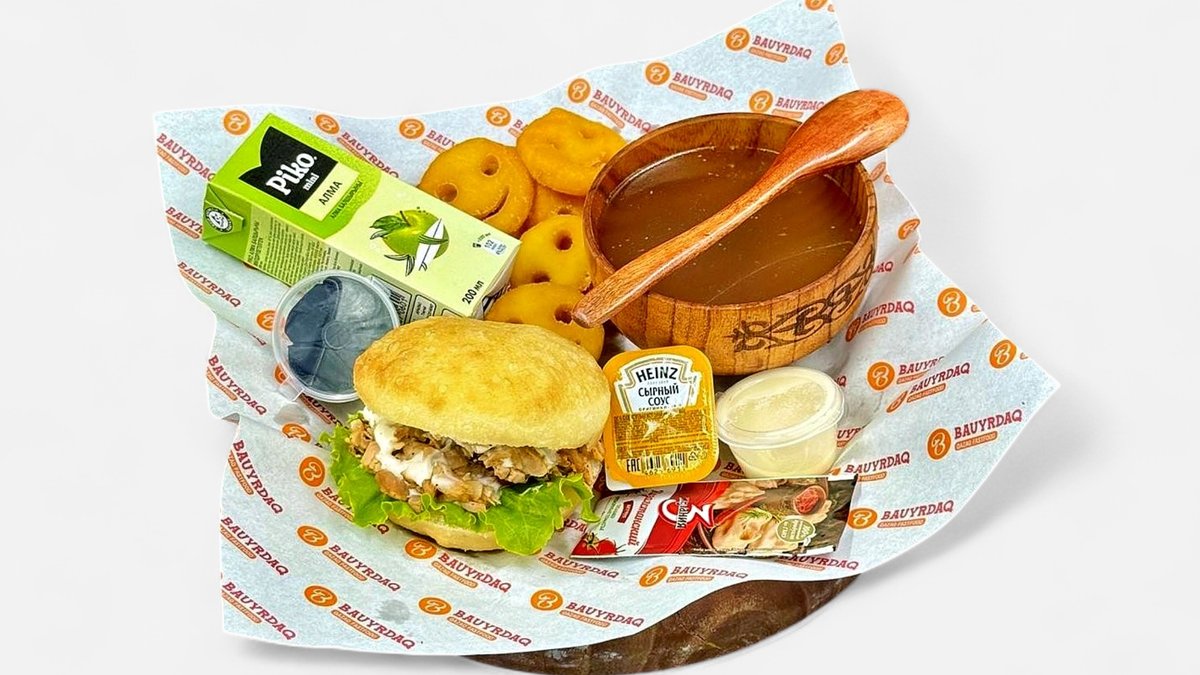 Мини классический бауырдак с курицей, костный бульон, курт, кетчуп, сырный соус, сок Piko яблоко (200 мл), фри
