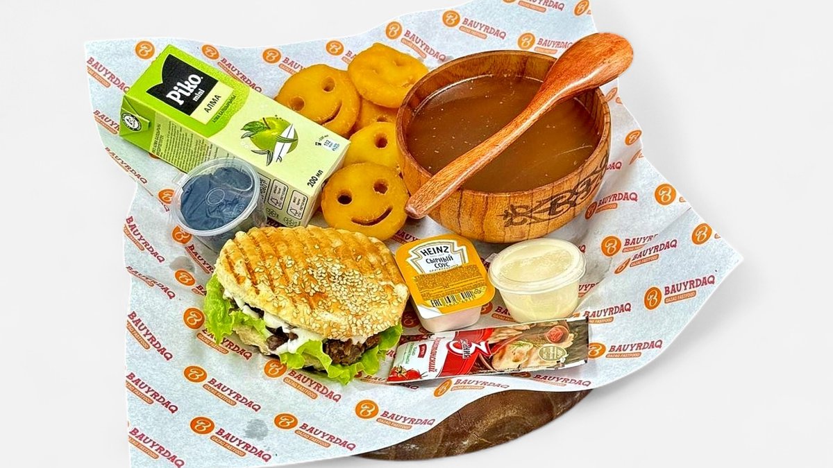 Мини классический бауырдак с говядиной, костный бульон, курт, кетчуп, сырный соус, сок Пико Яблоко, фри