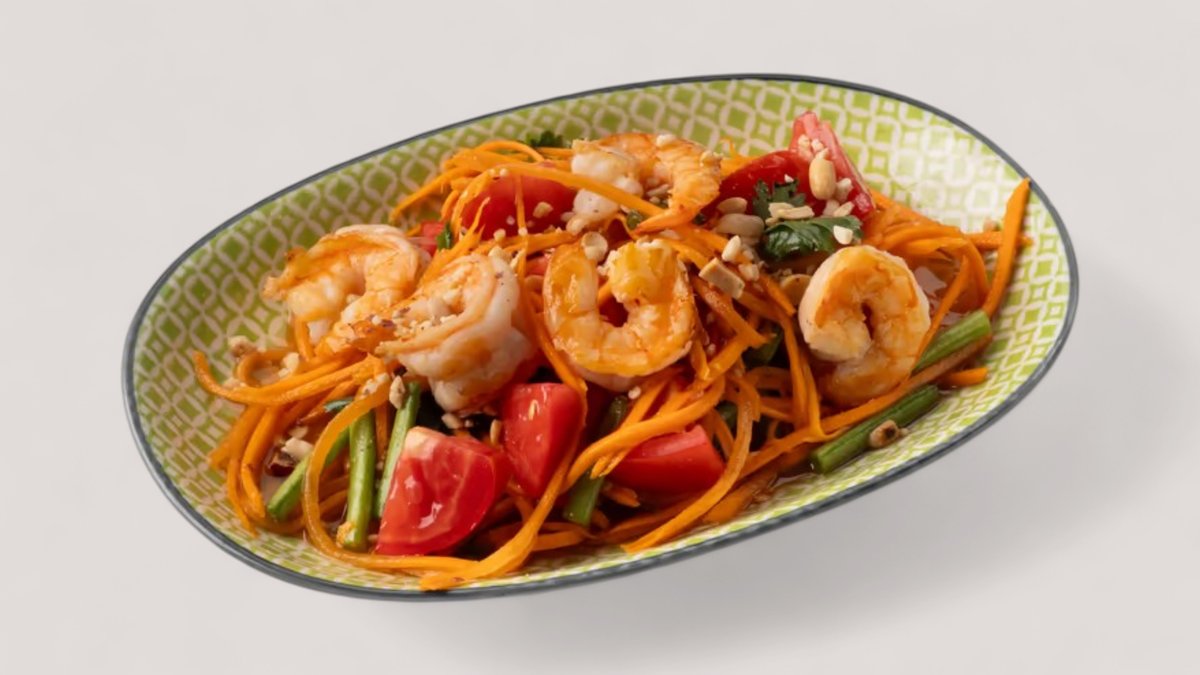 Салат из моркови, огурцов, тамаринда, с чесноком, арахисом, помидорами, и сухими креветками.