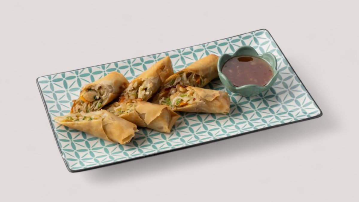 Хрустящие рулеты из тонкого теста с стеклянной лапшой, проросшими бобами, с кисло-сладким соусом