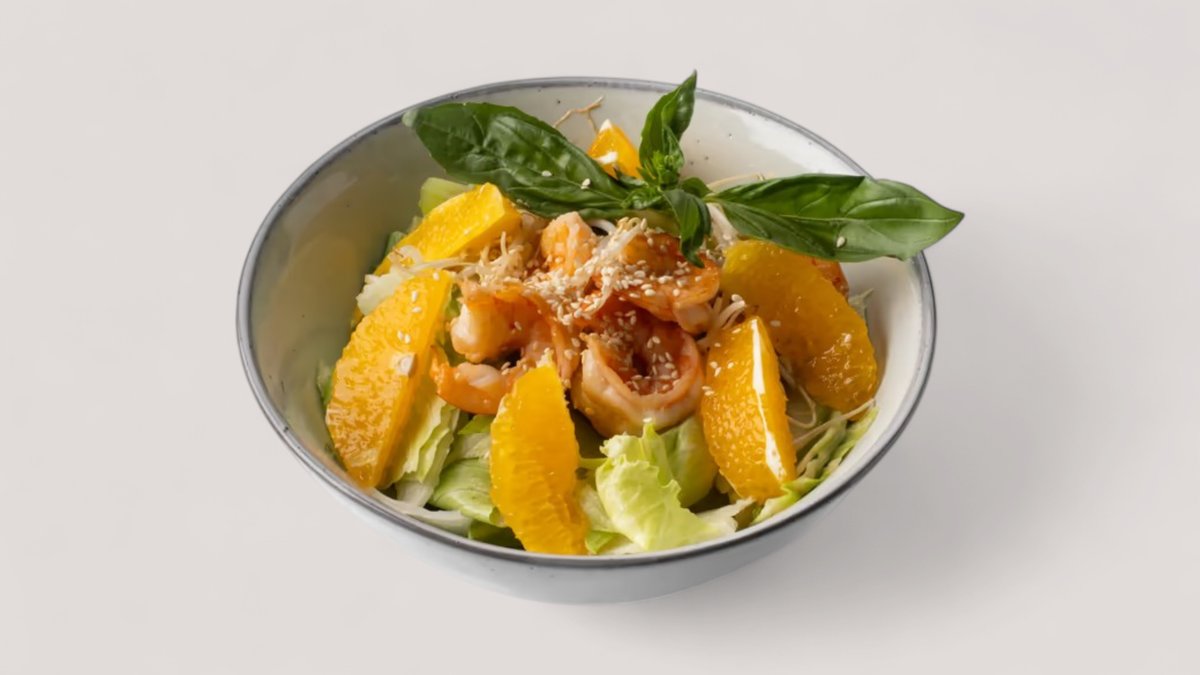 Креветки, айсберг, сельдерей, базилик, проросшие бобы, апельсин, в фирменном соусе